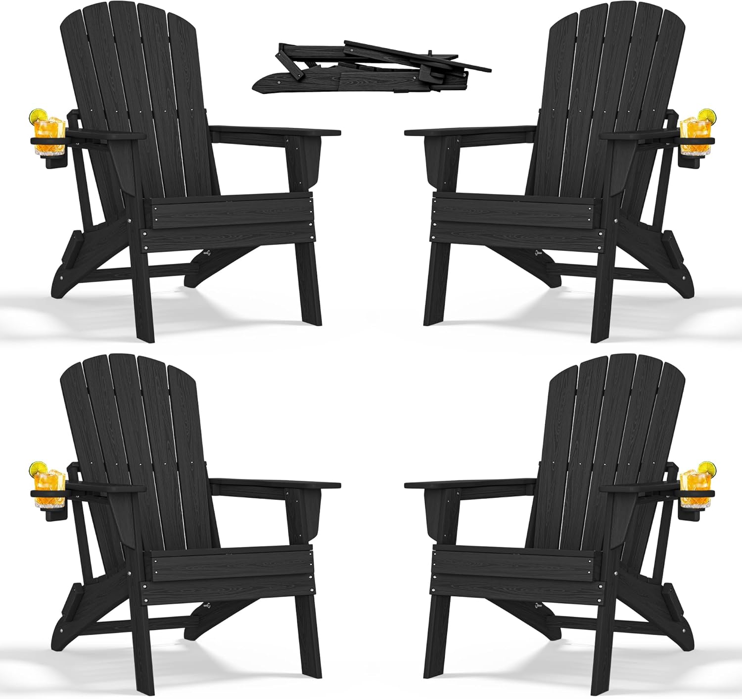 Folding Adirondack Chair - Extended Ergonomic Backrest, Cup Holder - Easy Assembly - Durable HDPE Plastic, Weather Resistant & Maintenance-Free - Lawn, Patio, Deck Supports 380lbs Black