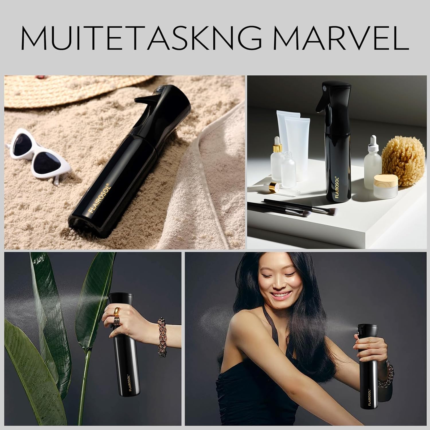 FLAIROSOL Spray Bottle for Hair, Continuous Spray Bottle with 0.3MM Ultra Fine Mist, Water Mister for Hairstyling, Cleaning, Plants, Pets, 10.1oz/300ml, Black Bottle, Gold Print