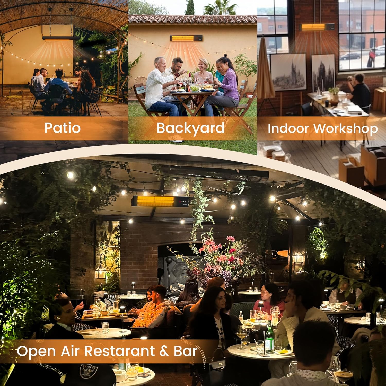 - POWERFUL HEATING FOR INSTANT COMFORT: Patio heater experiences powerful 1500W heating capacity with advanced graphene technology. The outdoor heater heats up instantly in just 0.5 seconds, electric patio heater delivering warmth up to 12 feet. Perfect for quick relief from the cold, infrared electric heater ensures your comfort in no time—no waiting, no shivering, just immediate, efficient warmth! This makes it an ideal infrared outdoor electric space heater—fast and powerful heating. VERSATILE INSTALLATION FOR ANY OUTDOOR SPACE: Wall-mounted heater lets you enjoy flexible installation with two mounting options—hang it from the ceiling for wide coverage or mount it on the wall for targeted heating, making it perfect for any outdoor space. Its hassle-free assembly requires just 3 simple steps, with most components pre-installed for quick setup. Suitable for various settings like gazebos, patios, or even as a garage heater, it adapts to your needs for both style and functionality. CUSTOMIZED HEATING EXPERIENCE AT YOUR FINGERTIPS: The 36-hour timer function, 4 adjustable heat levels, and memory function allow you to customize your heating experience. You can set the time and heat level according to your preferences. The outdoor space heater turns off automatically when the time is up, and the next time you start it, the patio heaters for outdoor use will automatically adjust back to the last heat level used. Enjoy a personalized heating experience tailored to your liking. SAFETY-FIRST DESIGN FOR OUTDOOR COMFORT: Designed with a modern aesthetic and your safety in mind, this radiant heater features overheating and tip-over protection, automatically shutting off power in risky situations to keep you and your family safe. These outdoor heaters for patio provide the ideal heating solution for a gazebo, balcony, BBQ area, or as an infrared heater. Its design and safety features make it perfect for outdoor comfort and peace of mind. MAXIMUM POWER OF 1500W: Due to the standard 110V US electrical outlet, the heater operates at a maximum power of 1,500W. In extremely cold weather conditions, the heater may have limited ability to warm the surrounding outdoor area effectively. Ideal for moderate to chilly climates for optimal performance