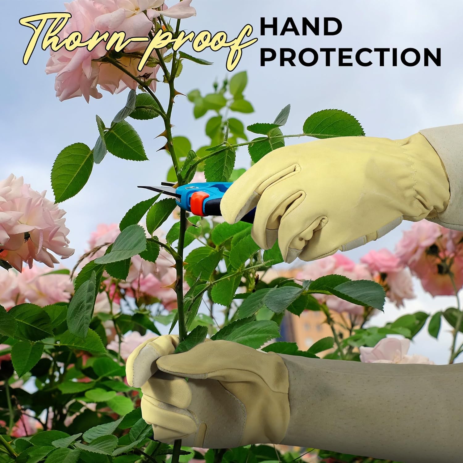 HANDLANDY Rose Pruning Gardening Gloves for Men Women, Thorn Proof Forearm Protection Leather Garden Gloves, Gardening Gifts for Gardeners (Beige- Goatskin, X-Large (Pack of 1))