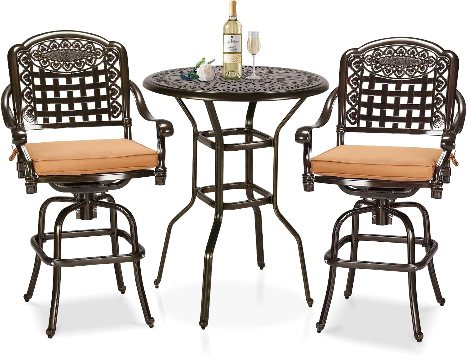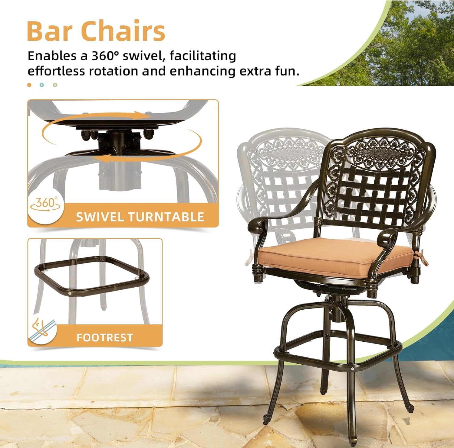 - 【Premium Materials】The outdoor swivel bar stools set is made from cast aluminum for long-term durability. Resistant to rust, weather, fade, crack. The patio furniture set features an oil-rubbed bronze finish for a timeless look that is designed to withstand the elements year-round. If you use this set by the pool, it’s all-weather quality helps prevent water damage caused by wet swimsuits and splashing. It is also easy to clean, you just need to use a cloth to easily wipe away the dirty things.