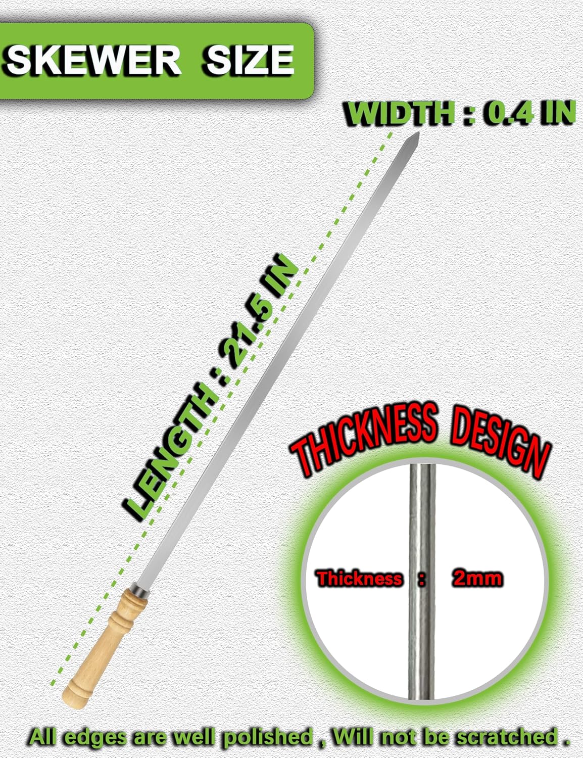 - 【FOOD GRADE 304 STAINLESS STEEL】JOWHONK BBQ 304 stainless steel skewers for grilling are 21.5 inches long,0.4 in width,0.07 in thickness. Our wooden handle flat metal skewers for kabobs are made of premium 304 stainless steel, Ensuring non-rust long time durability, Heat resistant and non-poisonous,Harder than other stainless steel and iron.It's safety for children.Our Premium Stainless steel Barbecue skewers are reusable. The BBQ kabob skewers surface is smooth that grilled food residue won't get stuck onto the kabob skewer blade.