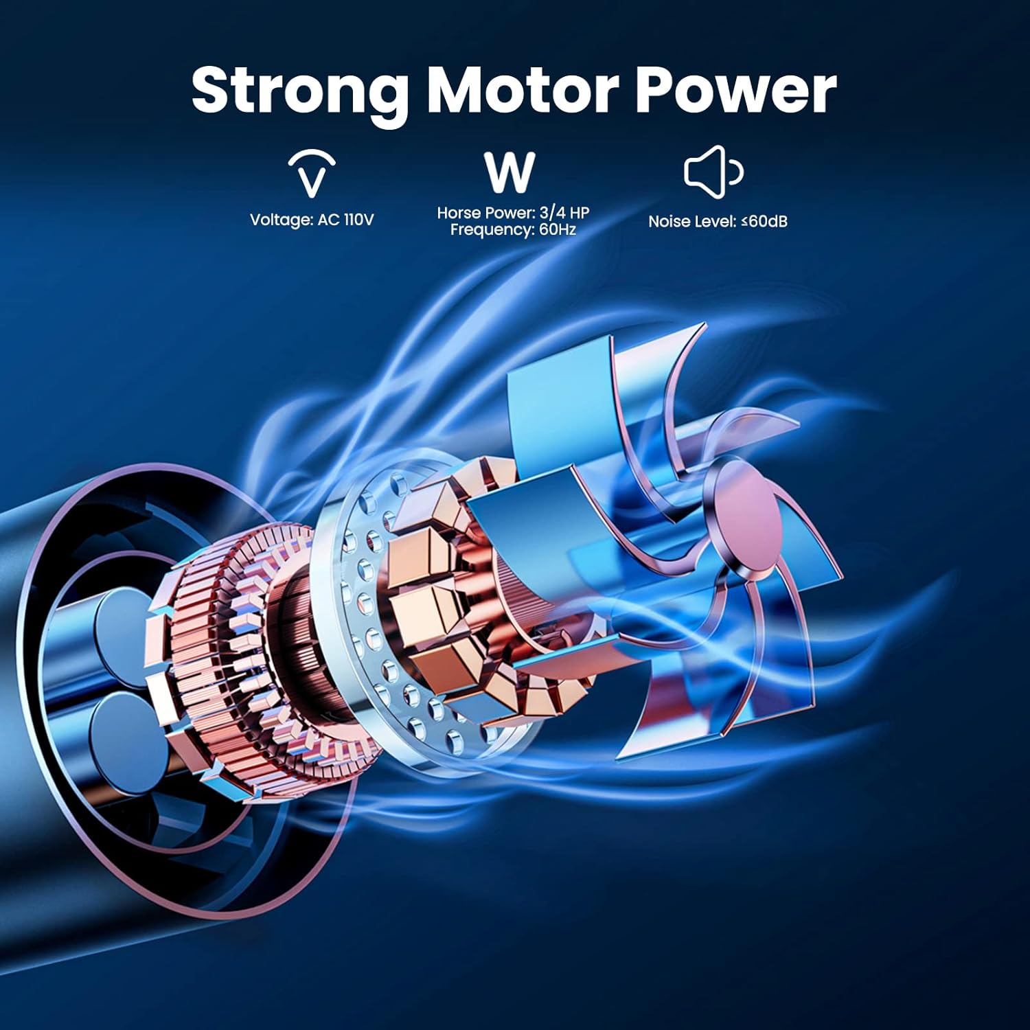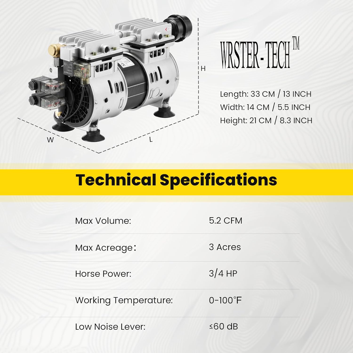 - 3/4 HP Air Compressor — Highly efficient and quiet 3/4 HP oil-free Rocking Piston Air Pump, with maximum 5.2 CFM air volume and below 60DB low noise level, strong power to promote the underwater oxygen circulation.