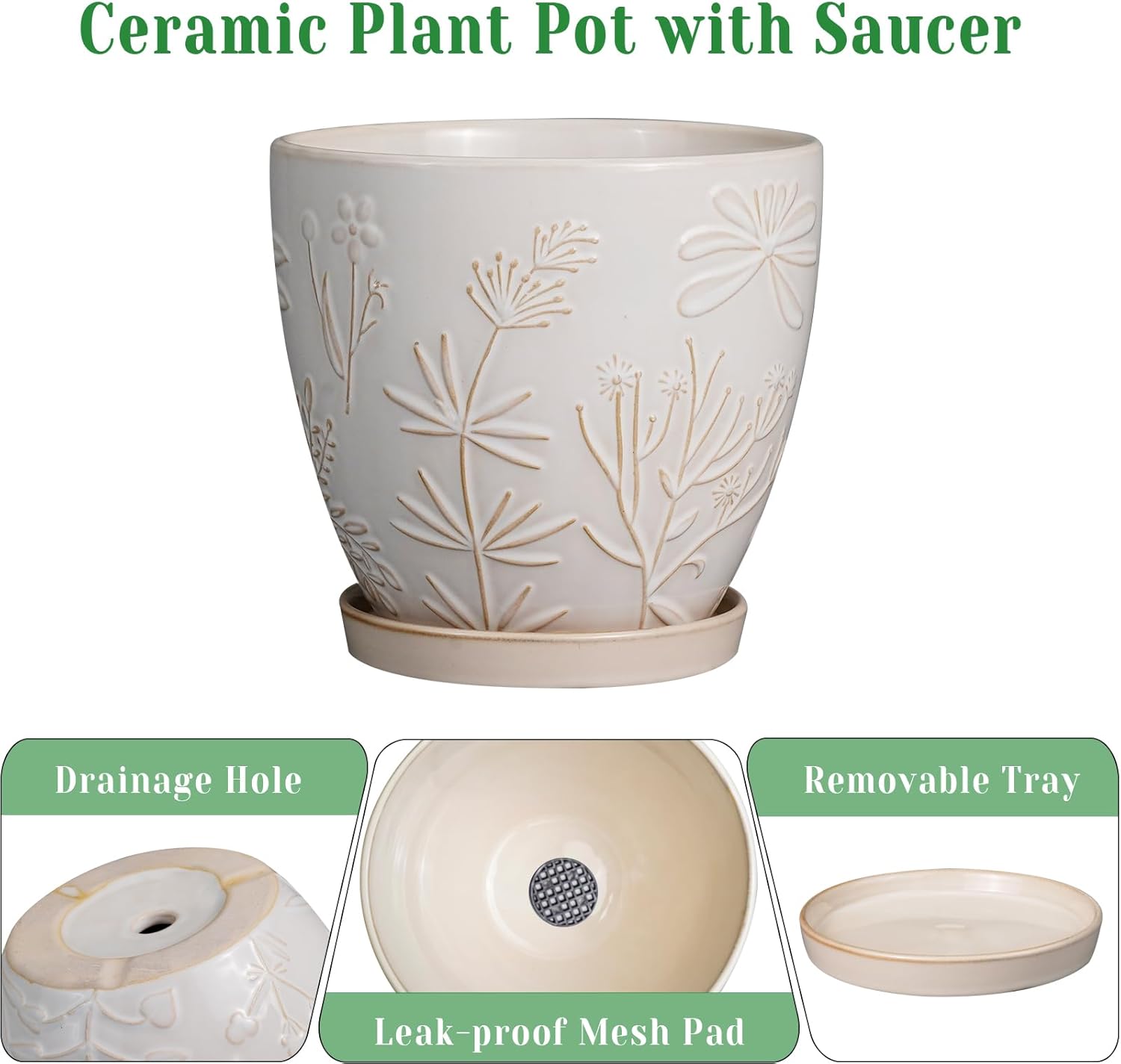 - Plant Pot with Drainage Hole and Saucer: This white plant pot with drainage holes allow for easy plant drainage, beneficial for plant respirationthe, ceramic tray to collect excess water, and the leak-proof mesh reduce soil erosion