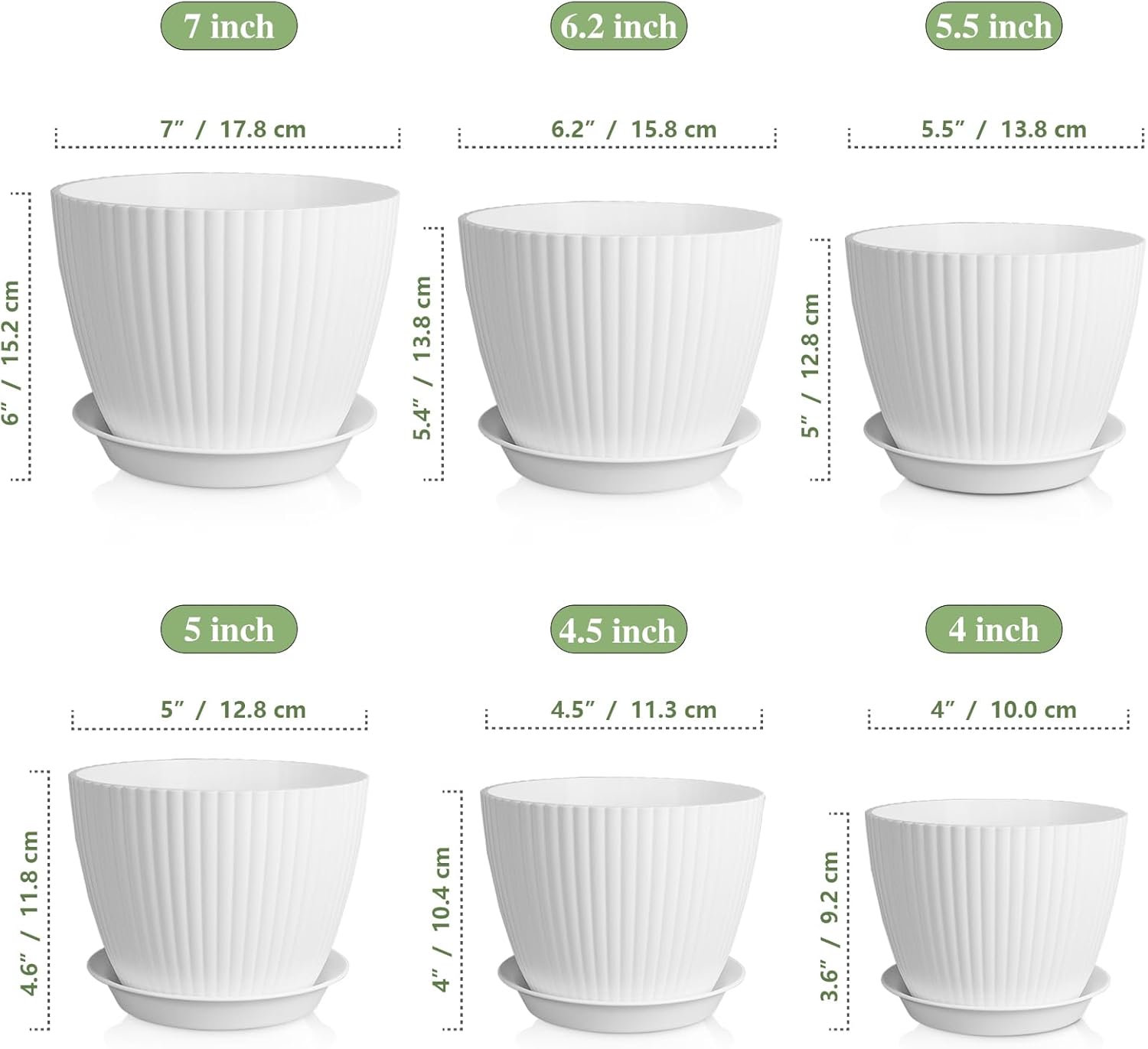 7/6.2/5.5/5/4.5/4 inch Plant Pots, 6 Pack Flower Pots for Small Indoor Outdoor Plants, Plastic Planters with Drainage Holes and Saucers for Garden Succulent House Plants, White