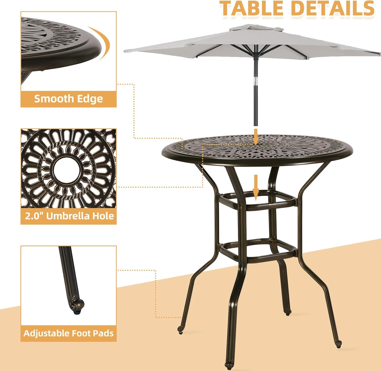 - 【Humanized Design】Patio bar height chairs with ergonomic high back, curved armrest and solid footrest which can support a great seating experience. Upgraded adjustable foot knobs to ensure the even legs while assembled, and more engraved details add an aesthetic touch of artful appeal for this counter height barstools. Featuring a 2” umbrella hole in the center of the table for your favorite umbrella. Putting on an umbrella can protect guests and the food on the table from direct sunlight.