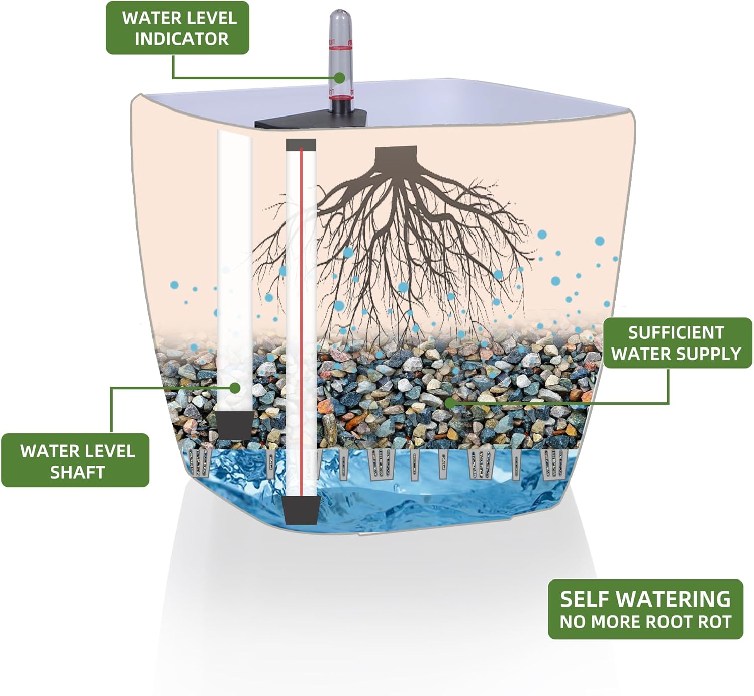 - SELF WATERING & NO MORE ROOT ROT - The smart unique sub-irrigation system is one of the most appealing aspects among all Dexceder planters. The easy-to-use separated integrated water reservoir or catcher- keeps your soil well aerated and automatic supplies plants with the right amount of ongoing moist air & nutrition for optimal growth. The insert indicator shows you the exact time to water again. The full water supply period can single-handedly last over 3 weeks based on different live plants