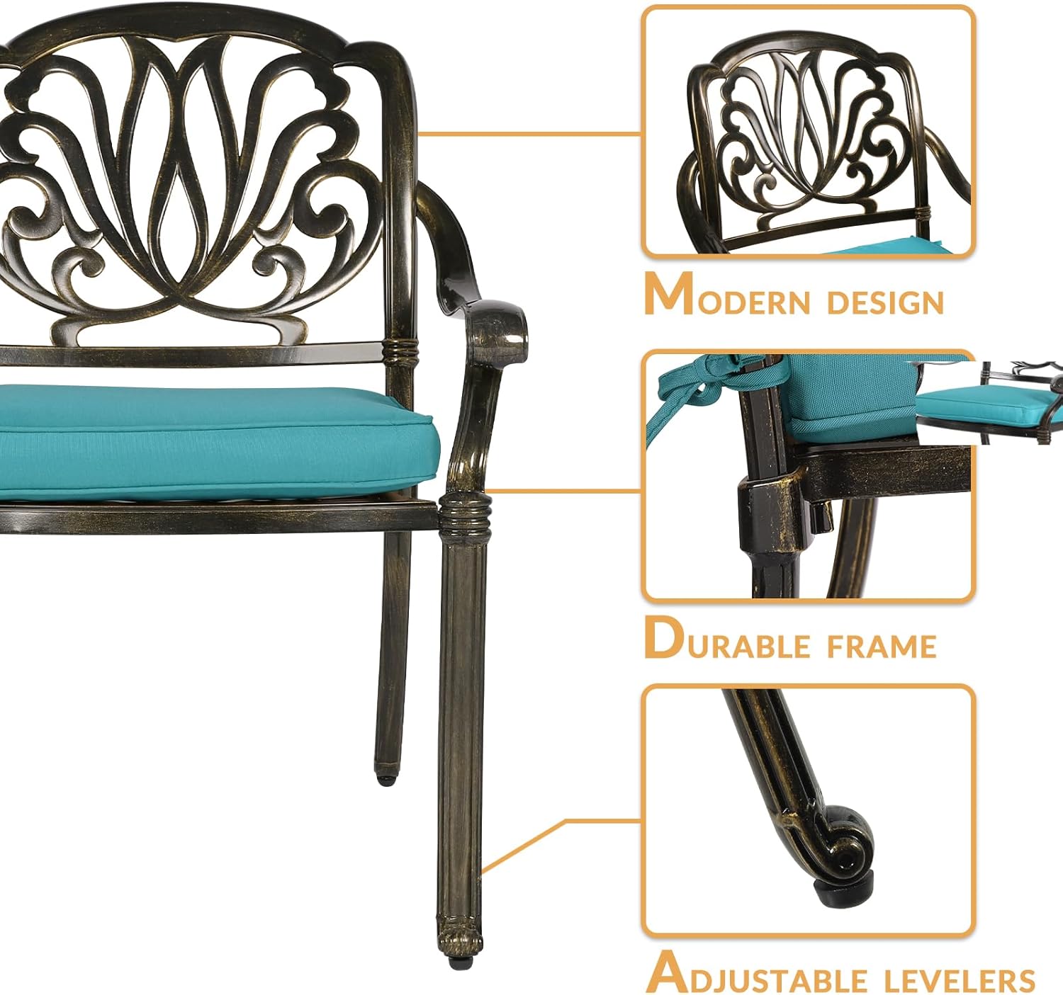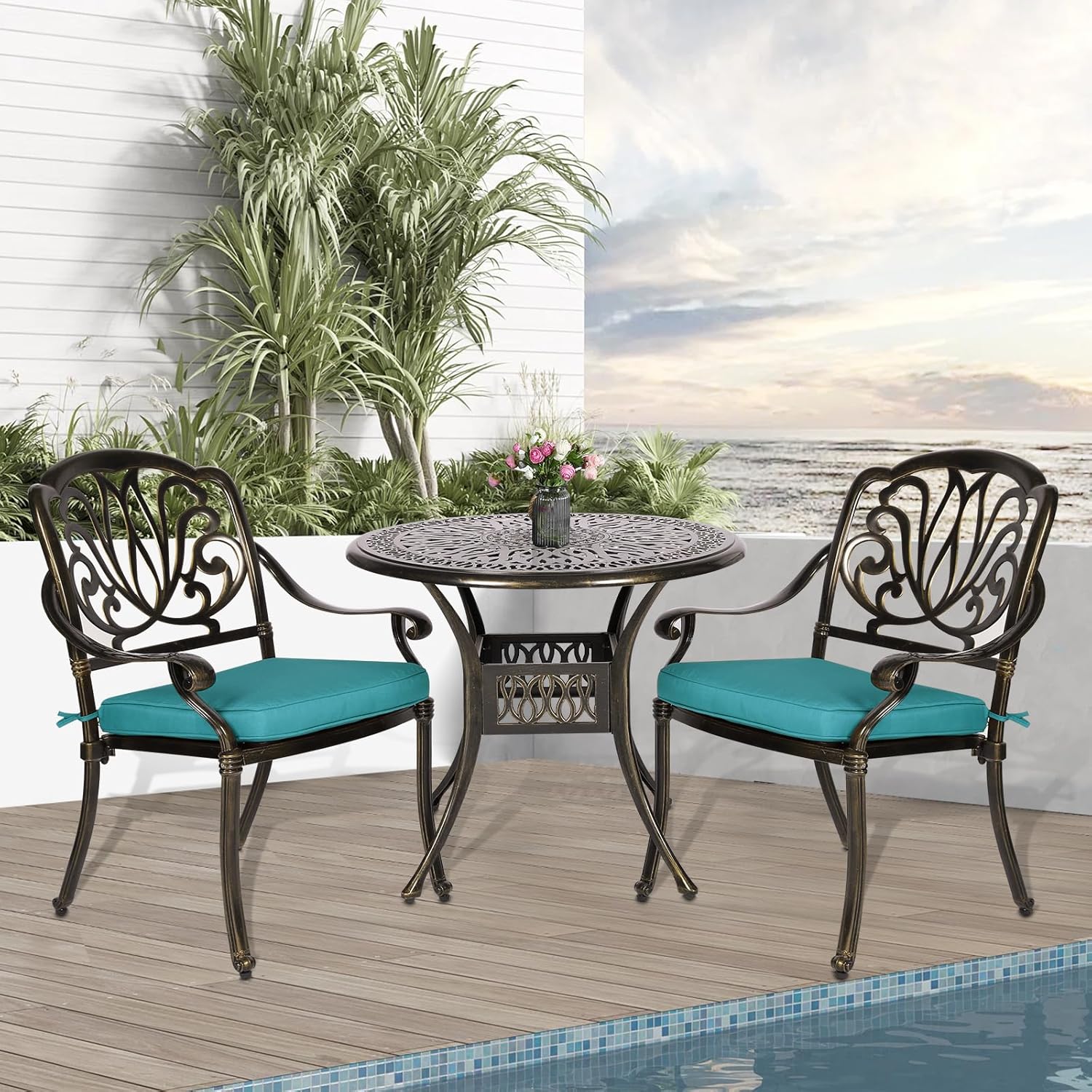 - 【Durable 3-Piece Dining Set】 - Made from cast aluminum for long-term durability. Resistant to rust, weather, fade, crack. This patio set includes 1 round table, 2 chairs, 2 cushions, and they stay in perfect condition regardless of the weather. It's also easier than ever to clean, just use a dry or damp rag to wipe down.