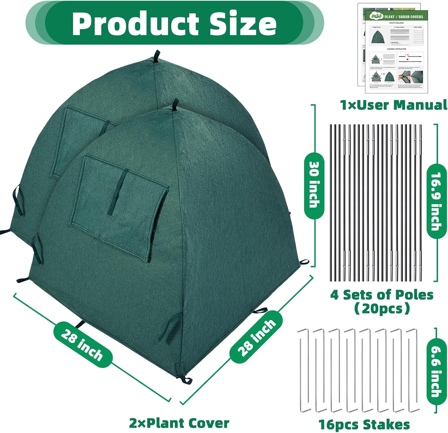 2 Packs Plant Cover Freeze Protection Blanket, 28''x28''x30'' Outdoor Garden Fabric Cover with Poles and Stakes for Winter Frost, Shade Cloth Plant Guard for Shrubs, Small Trees, Green