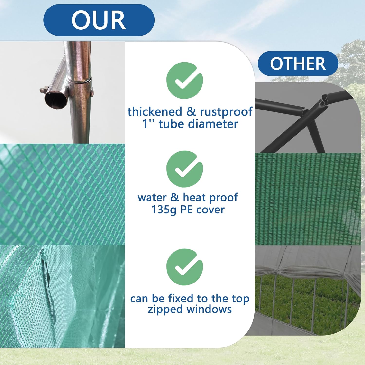 - 【Outdoor PE Cover】 This green houses for outside coated with a UV protective coating to provide your plants with comprehensive protection from sun, rain and snow and control heat, humidity and stop sun damage by blocking UV.