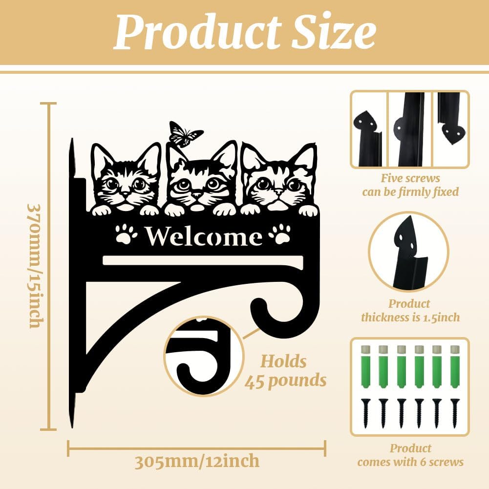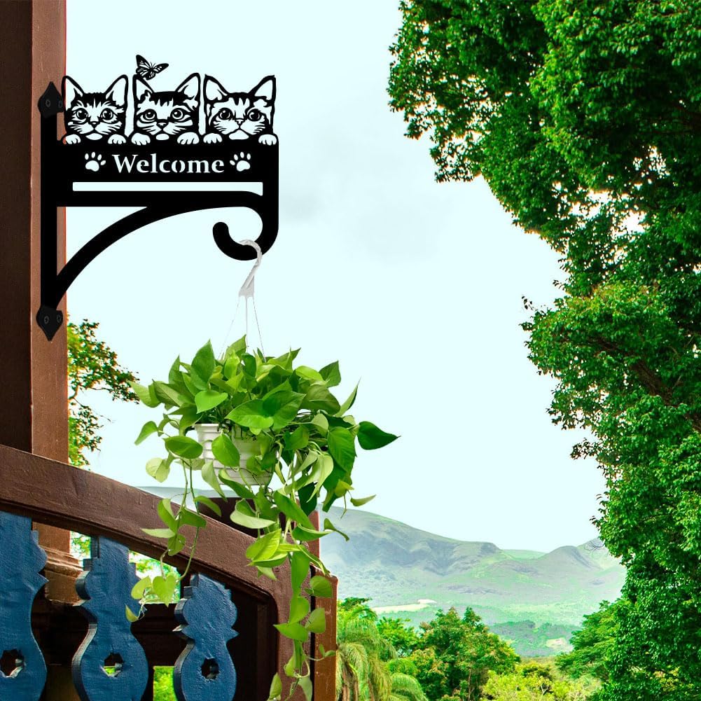 peacoblue Iron Plant Hangers Hooks Cat with Welcome for Outdoor Indoor Hanging Plants Flower Fern Pots Lantern Bird Feeder, 12"x15" Weather Resistant Metal Wall Holder for Porch Garden Farmhouse
