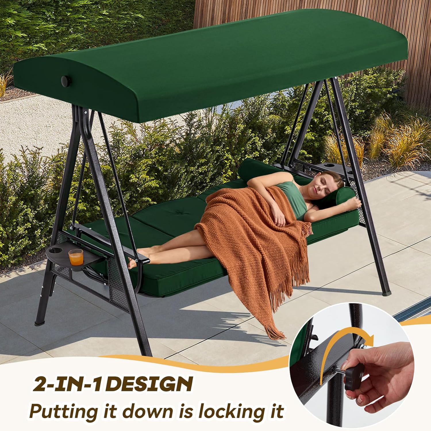 3 in 1 Outdoor Porch Swing with Canopy, 3 Seat Outdoor Swing for Adults, Patio Swing Chair with Thickened Cushions,Pillows & Cup Holders for Backyard, Porch, Garden (Green)