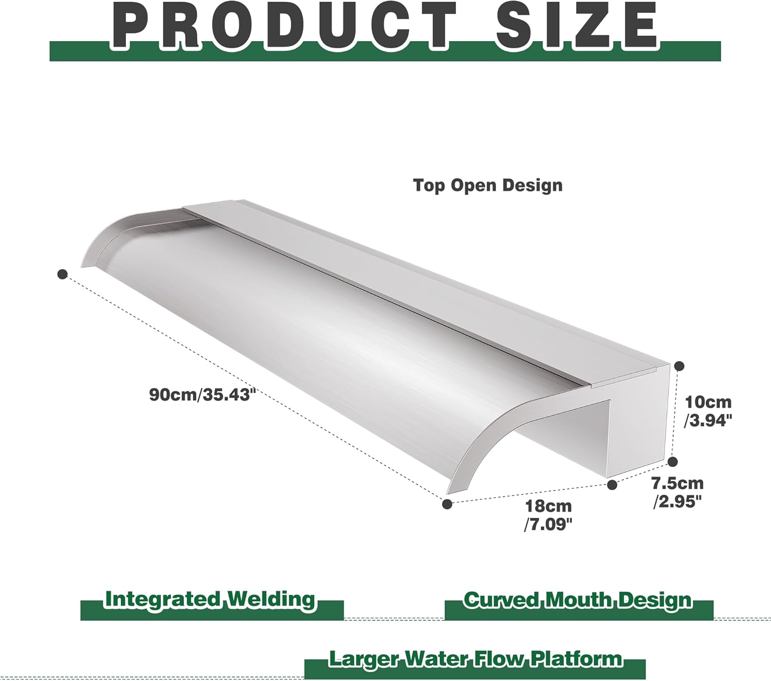 - ăAnti-Rust Spillway Waterfallă- Our welded in one body one-piece 304 stainless steel construction of this spillway waterfall provides long-lasting strength, rust resistance, and leakproof performance. The open lip design creates an elegant freefalling waterfall that adds decorative flair to ponds and pools. The soothing sound of the cascading water promotes relaxation and tranquility. LED light strips not included, but available separately.