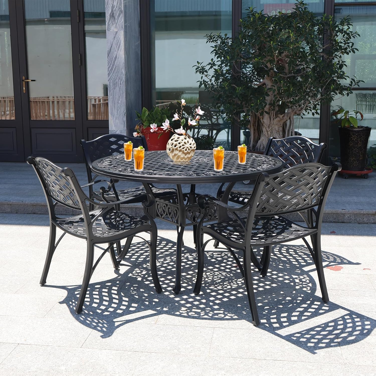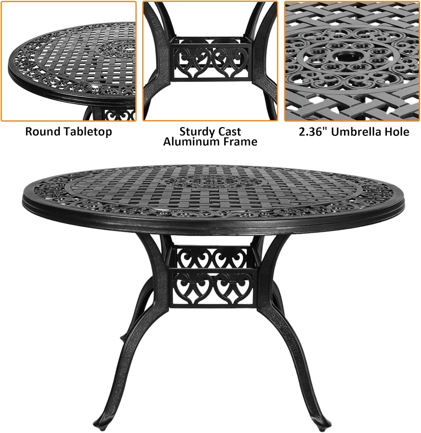 7 Pieces Cast Aluminium Patio Dining Set for 6 Person,Round 48" Patio Table and 6 Chair with 2.3" Umbrella Hole,Outdoor Patio Dining Set for Porch Backyard Deck, Black