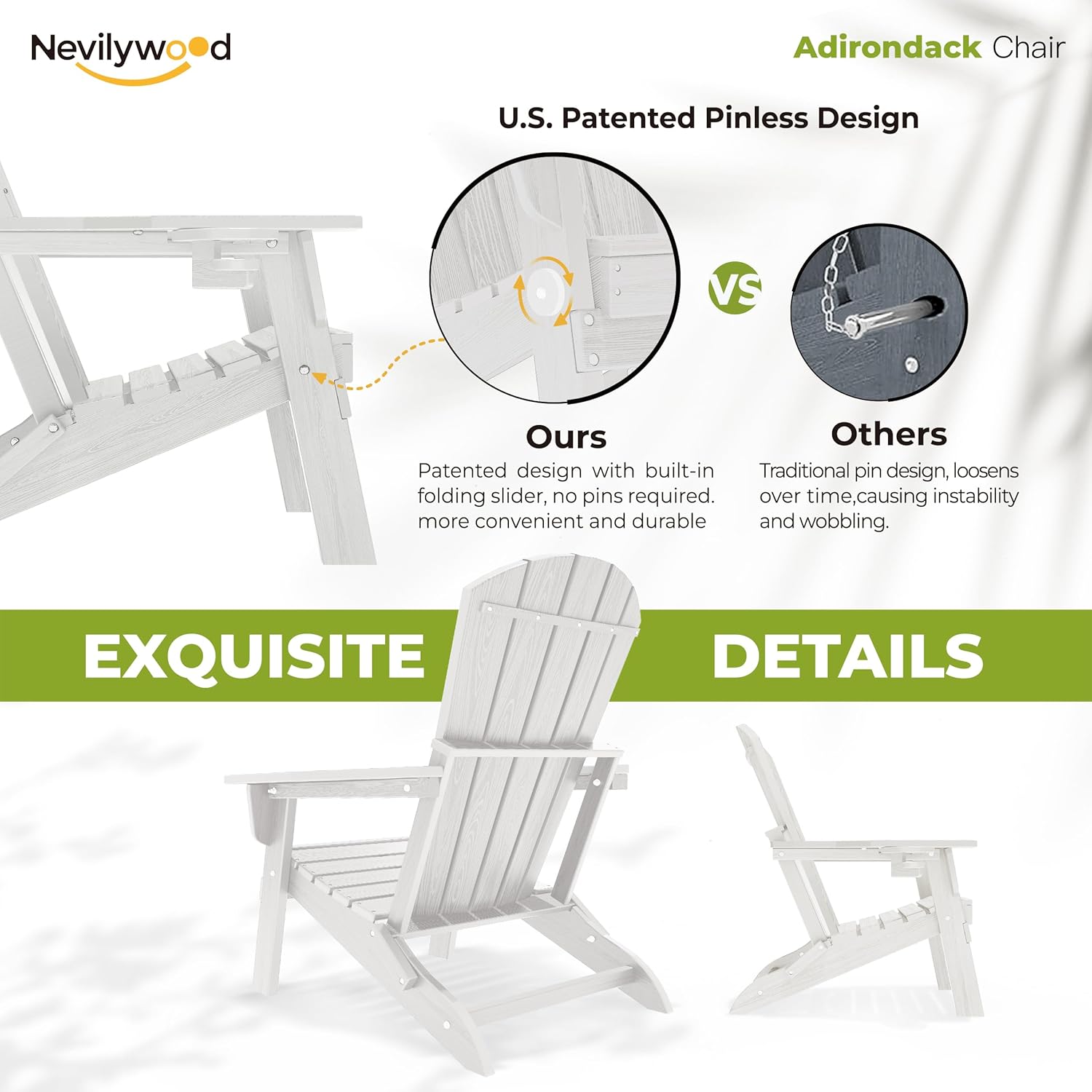 - 🌟Patented Foldable Design with Safety in Mind: Nevilywood folding patio chairs make outdoor living effortless, whether at a family barbecue or on a weekend getaway. These outside chairs feature a unique pin-free folding design for quick and easy transport. Prioritizing safety, our chairs have no sharp edges or complex mechanisms, so you can relax and enjoy the moment with peace of mind.