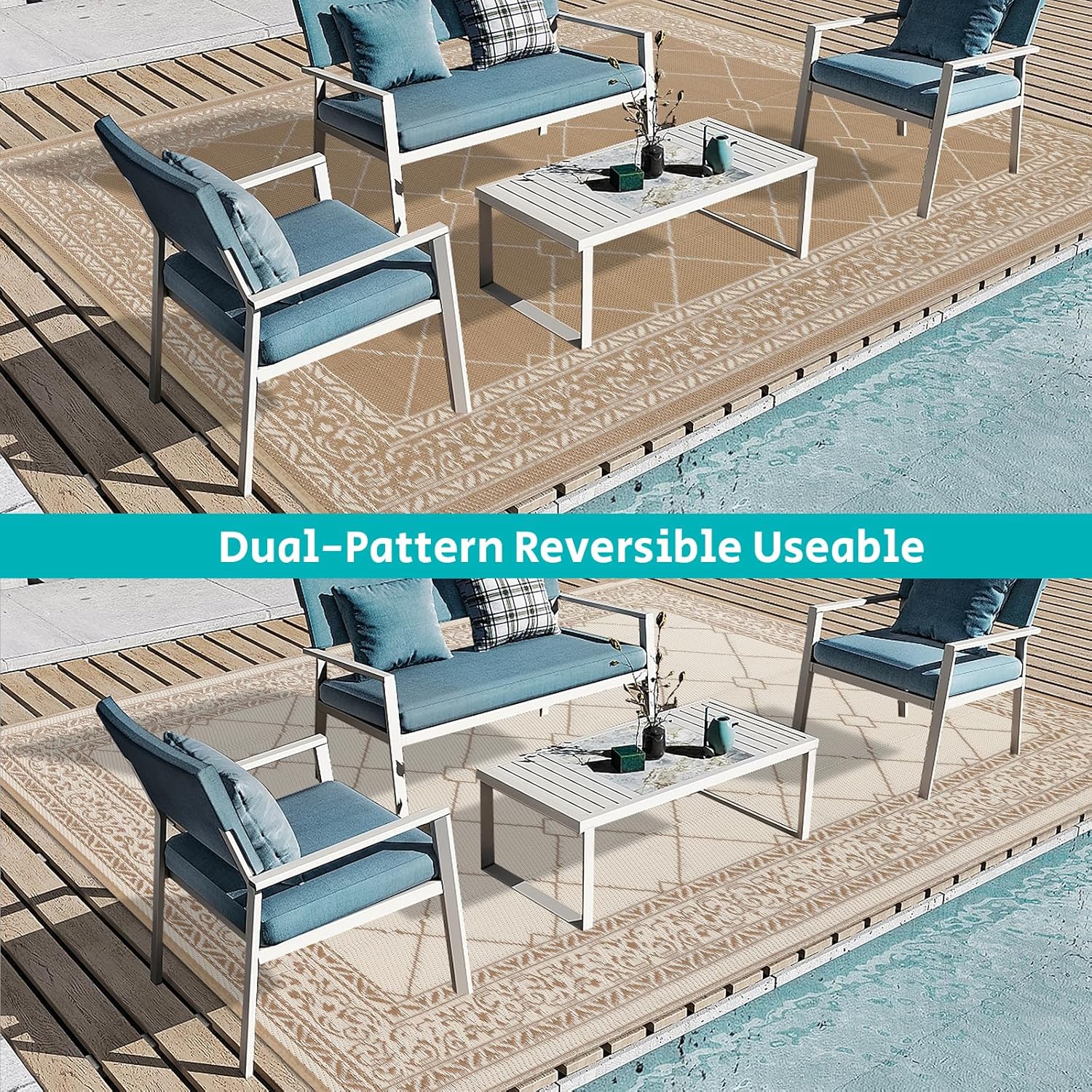 - Reversible Outdoor Rugs: Featuring a classic moroccan pattern on both sides, this 9x12 ft outdoor area rug allows you to instantly refresh your patio, porch, backyard, deck, RV campsite. And this outdoor deck rug is reversible, two-sided design allows you to have two different looks,both sides can blend perfectly with nature and look very full and comfortable.