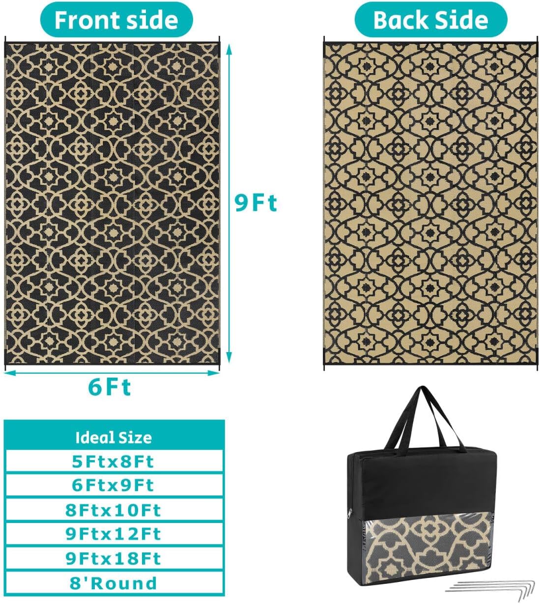 - XL Large Reversible Outdoor Rugs: Featuring a classic moroccan pattern on both sides, this rectangular 6x9 ft outdoor area rug allows you to instantly refresh your patio, porch, backyard, deck, RV campsite. And this outdoor deck rug is reversible, two-sided design allows you to have two different looks,both sides can blend perfectly with nature and look very full and comfortable.