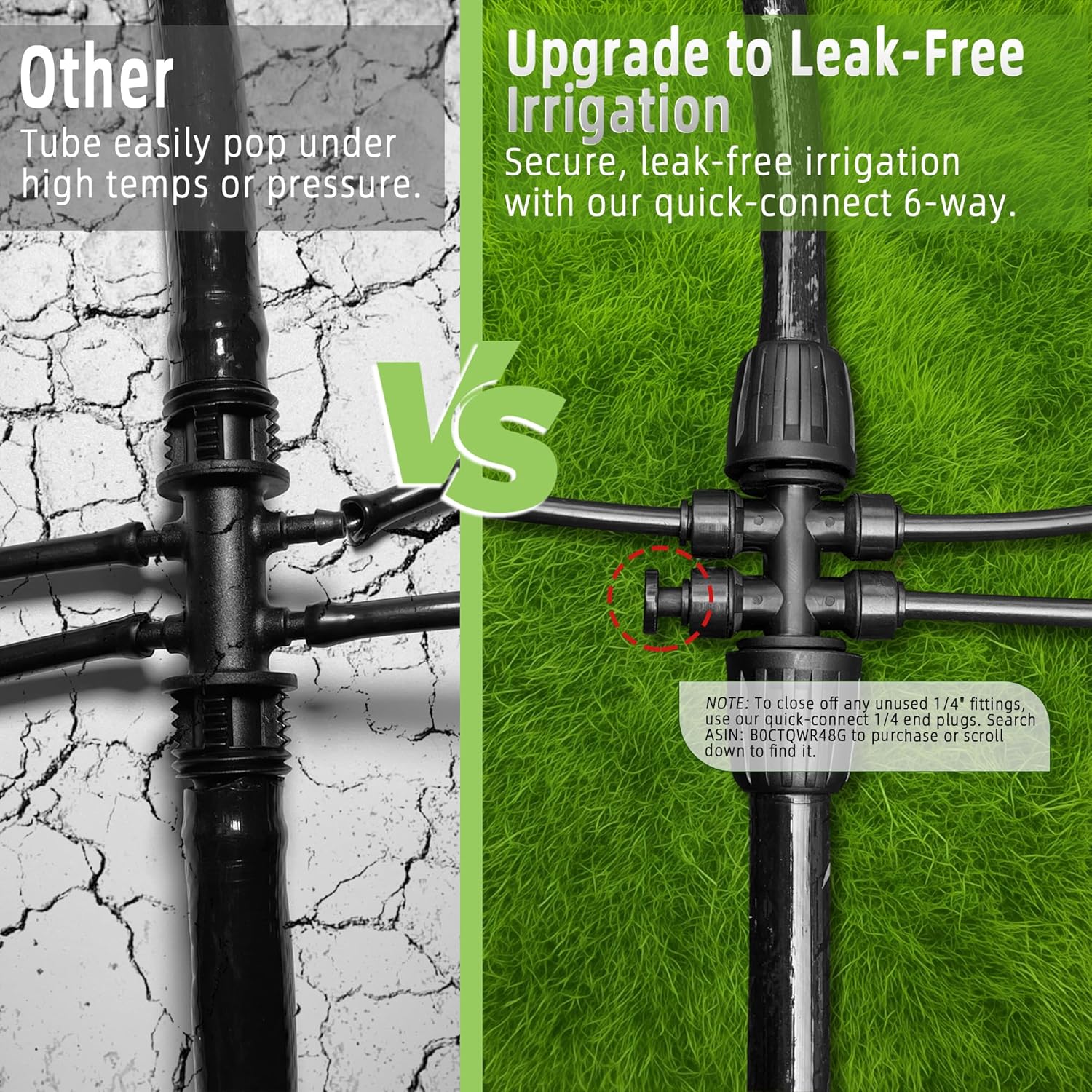 - Built to Last: The 6-way drip irrigation parts is made of sturdy, high quality plastic that is durable enough to withstand the rigors of outdoor use and not easy to deform and break. Say goodbye to the worry of traditional tee barbed connectors that can fall off and leak in the heat and sun.