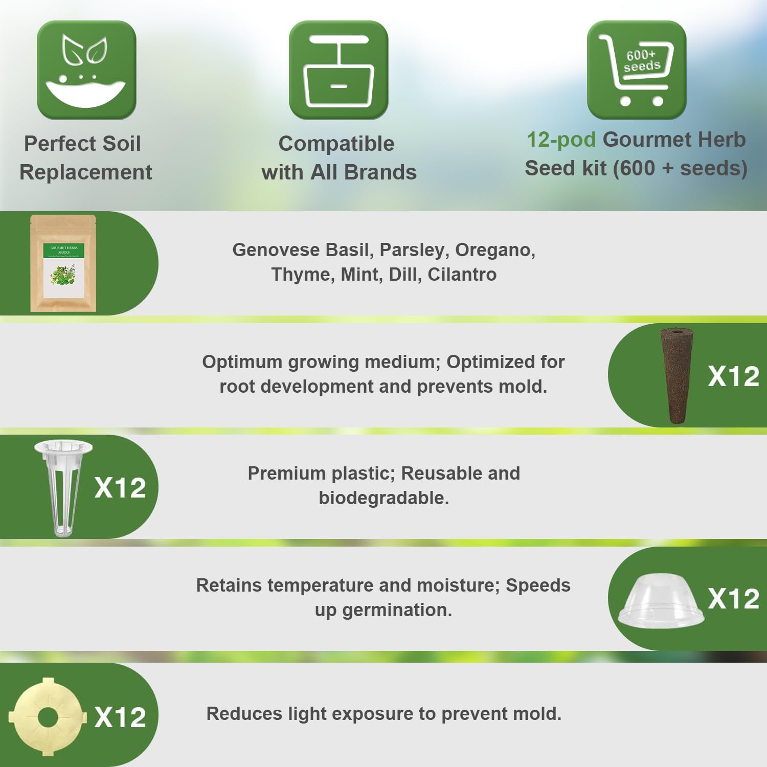 Gourmet Herbs Seed Pod Kit for AeroGarden, iDoo, Ahopegarden, MUFGA Hydroponics Garden with Basil, Parsley, Thyme, Mint, Cilantro, Dill, Oregano - Compatible with All Hydroponics (12-Pod)