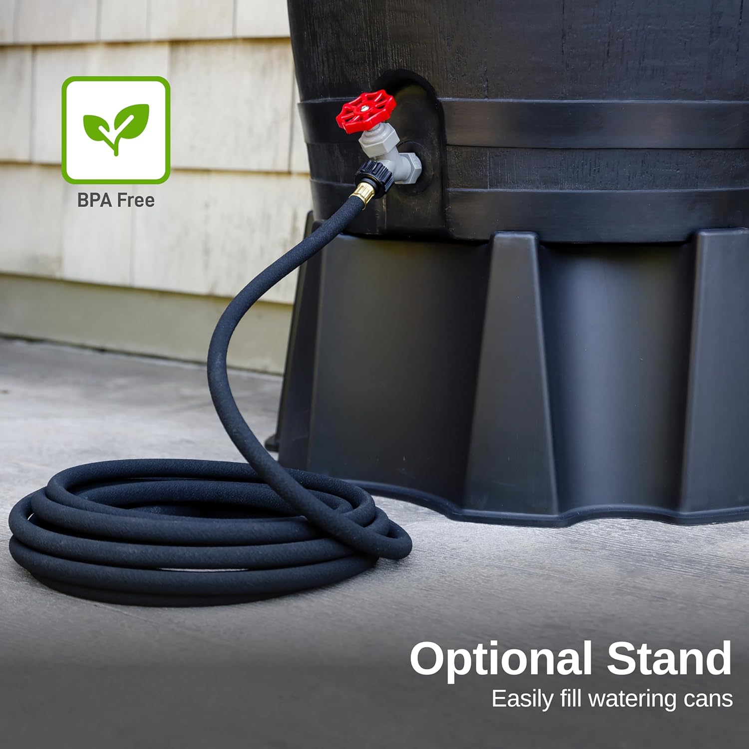 - Includes rain barrel, rain barrel screen, plastic spigot, 25-foot soaker hose. Rain barrel stand sold separately.