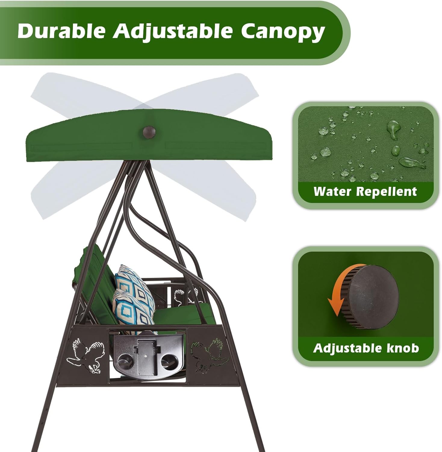 3-Seat Outdoor Porch Swing with Stand Patio Swing with Canopy 2 in 1 Porch Swing Bed & Patio Swing Chair for Adult w/Extra Pillows and Cup Holder for Yard(Green)
