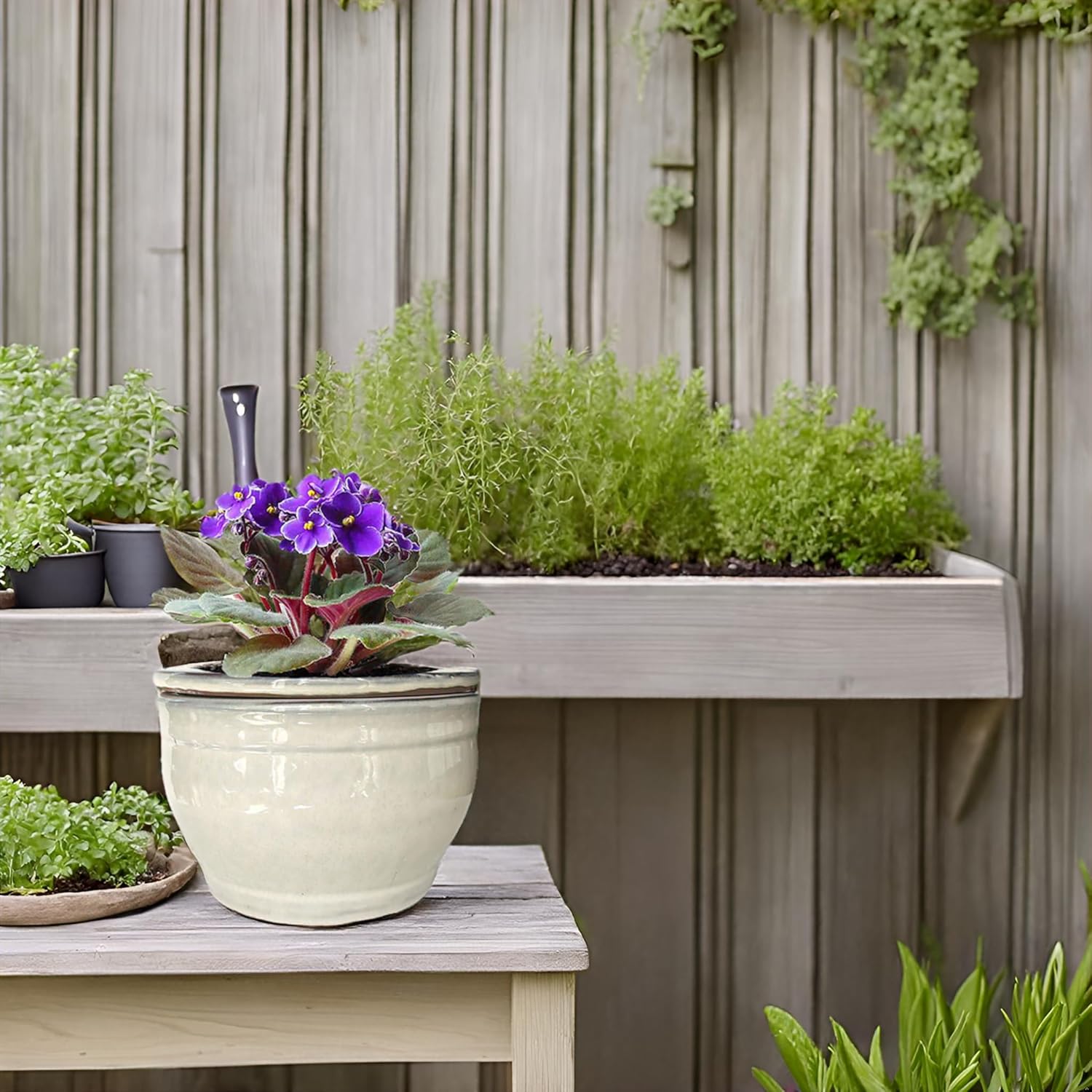 - Violet pots self watering material is ceramic,outer pot does not leak, so you can put it on the living room table, on the desk, on the windowsill, in the kitchen, you can also put it on the outdoor table.