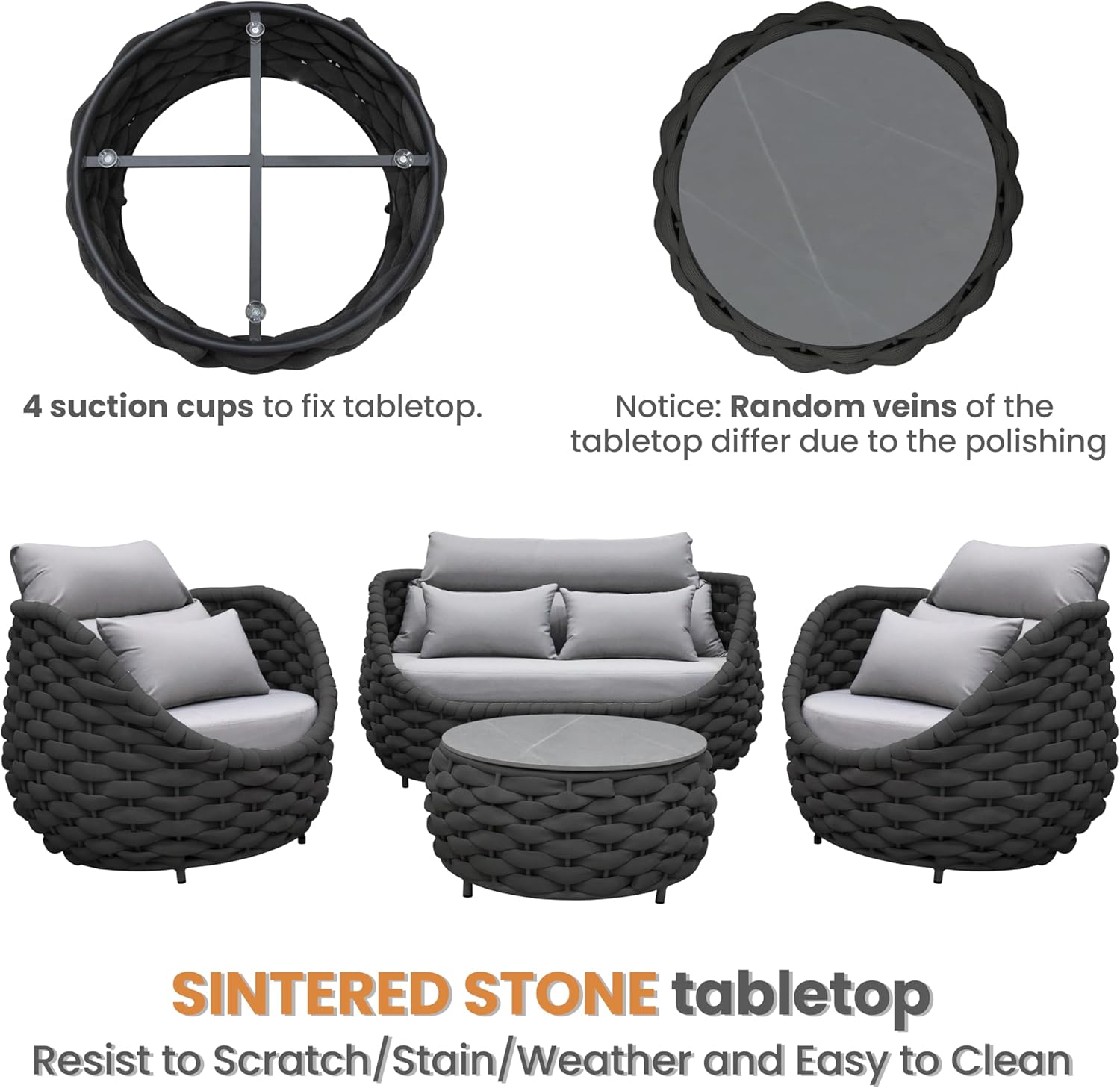 - Easy cleaning and scratch-resistant sintered stone tabletop is fixed by suction cups. Cushions cover replaceable removal and machine washable. Adjustable feet levelers for uneven floor also prevent scratching