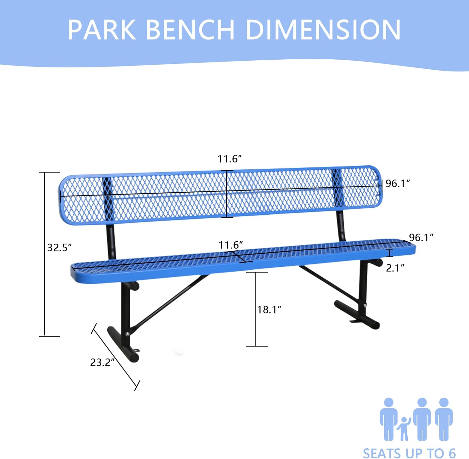 8FT Heavy Duty Park Bench with Back Portable Frame, Outdoor Steel Bench with Backrest, Outdoor Park Bench Expanded Metal Mesh Bench for Lawn, Park, Deck, Garden, Patio, Porch, Black (Blue, 8FT)