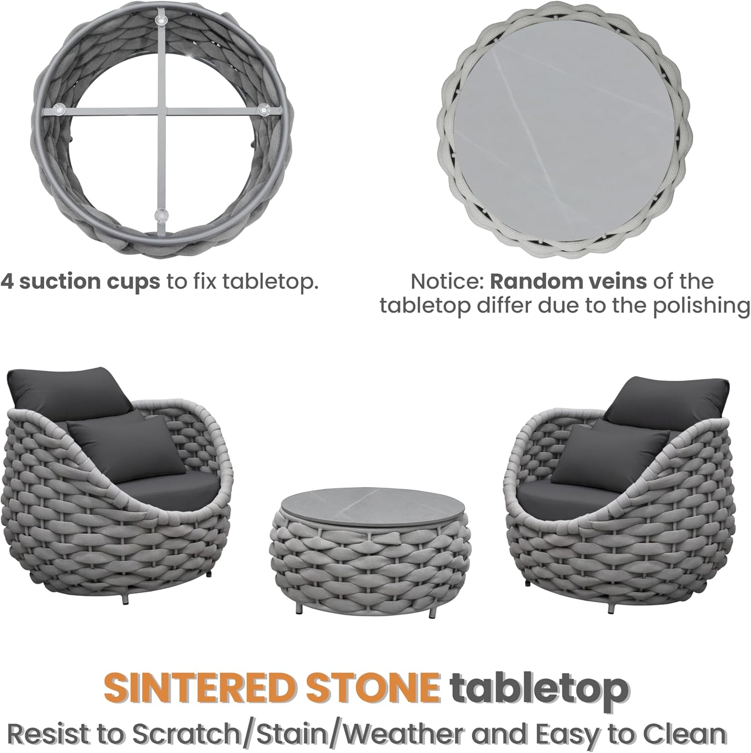 - Furniture set is crafted from reinforced rust-free aluminum frame, wrapped in Textilene hand woven rope. The 3 pieces all weather patio upholstered conversation set resists to UV, rain, wind, salt water. Perfect for indoor outdoor even arid or coastal areas
