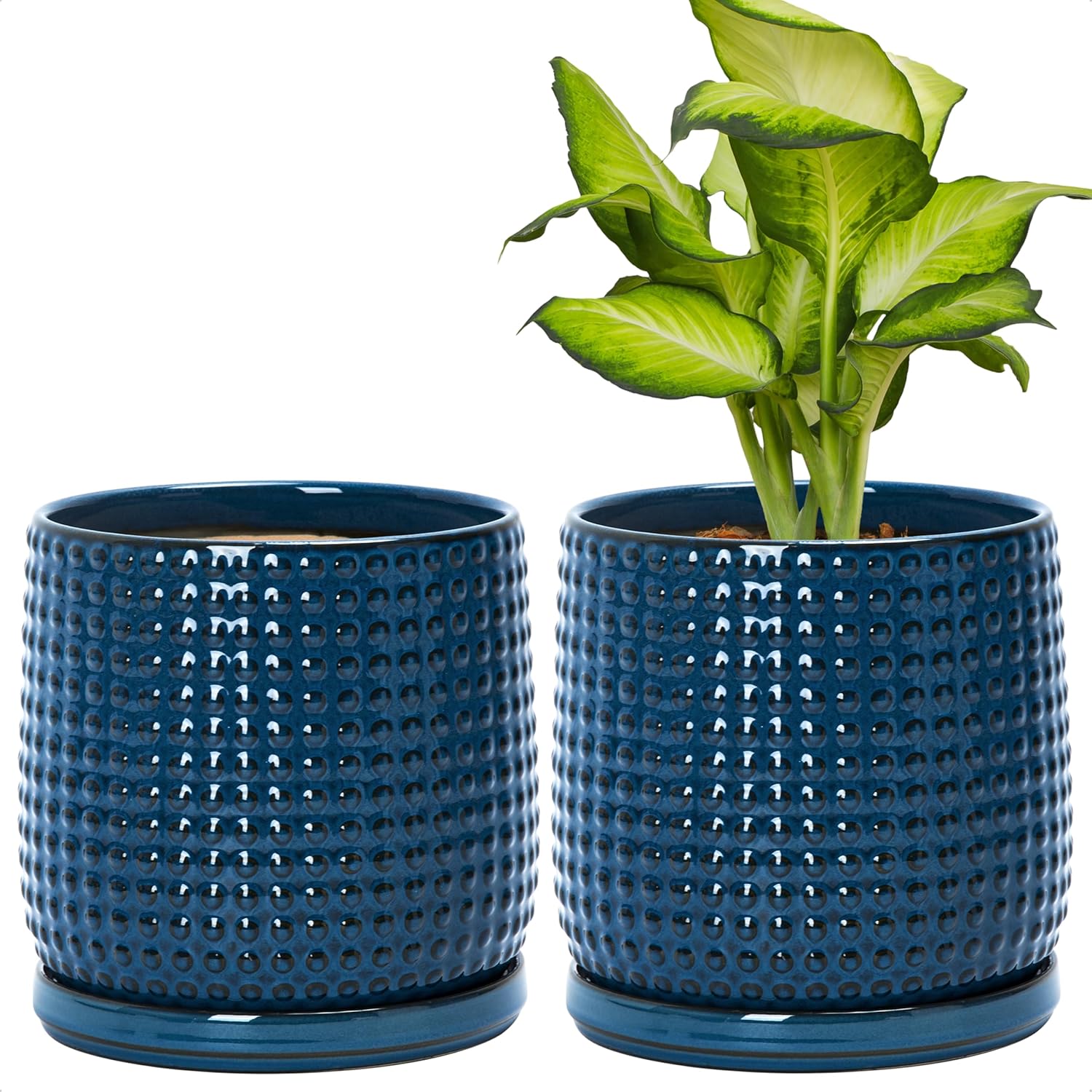 D'vine Dev Set of 2 Ceramic Plants Pots, 6 Inch Beaded Stoneware Flower Pot for Plants with Drainage Hole and Saucer, Midnight Blue, 27-E-X-3