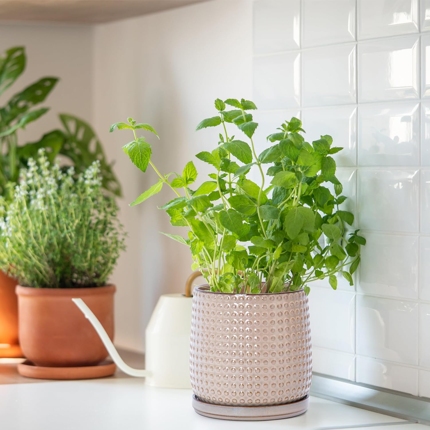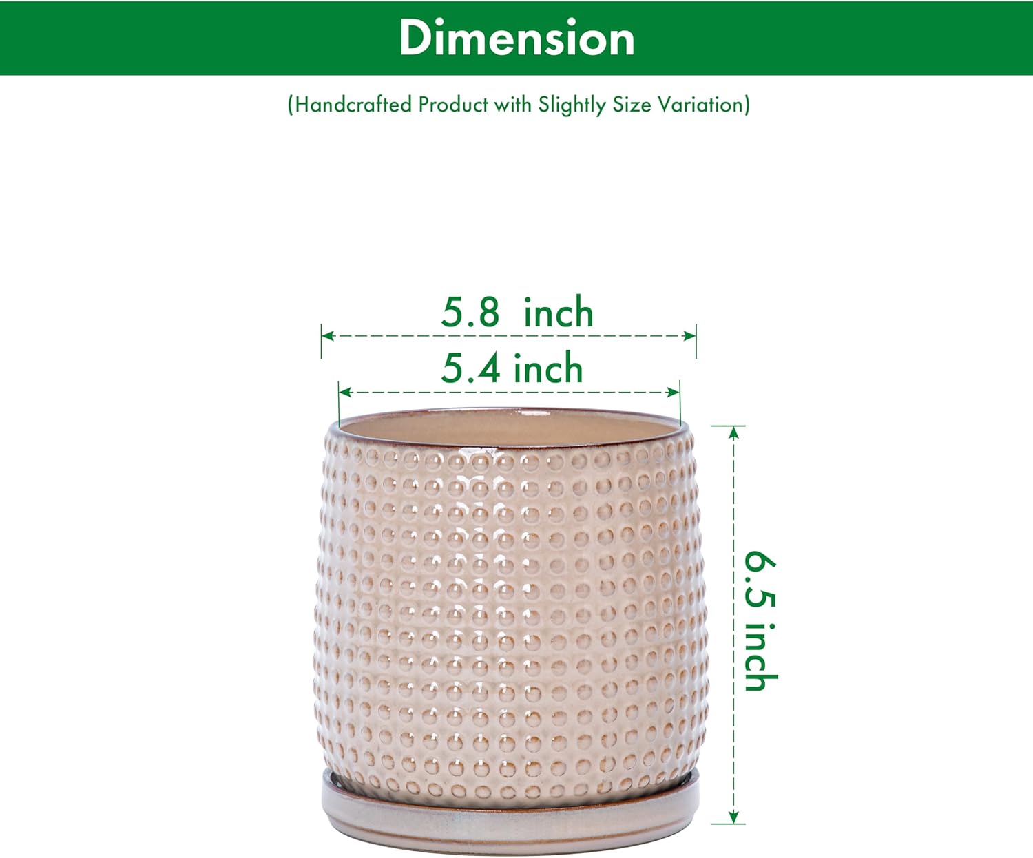 D'vine Dev Set of 2 Ceramic Plants Pots, 6 Inch Beaded Stoneware Flower Pot for Plants with Drainage Hole and Saucer, Light Brown, 27-E-X-4