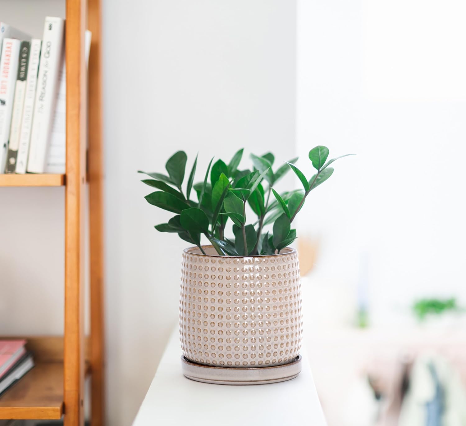 D'vine Dev Set of 2 Ceramic Plants Pots, 4 Inch Beaded Stoneware Flower Pot for Plants with Drainage Hole and Saucer, Light Brown, 27-E-Z-4