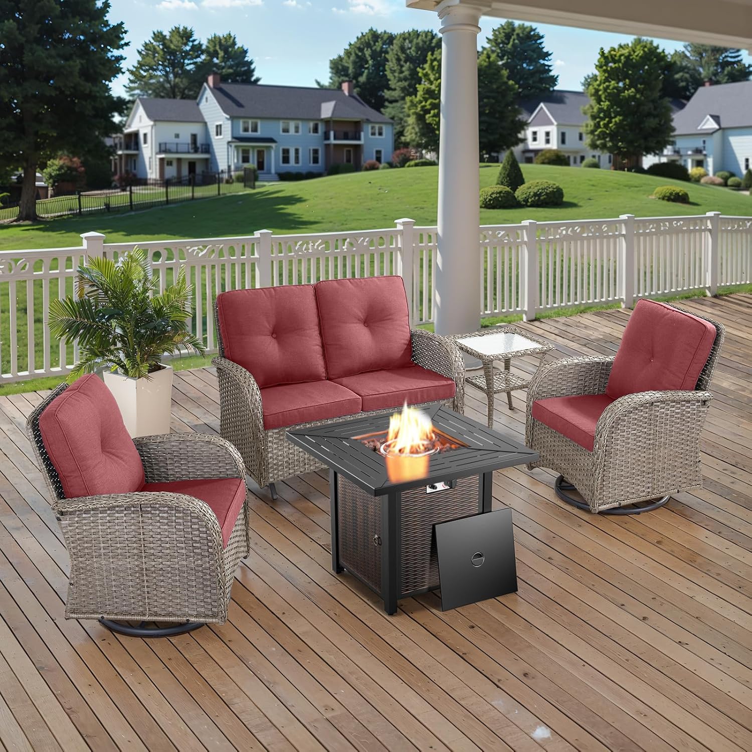 - Belord 5-piece outdoor patio furniture set is the perfect addition to any outdoor space, combining comfort, durability, and functionality. It includes two swivel rocker chairs, a loveseat glider chair, a side table, and a 30-inch propane fire pit table with a powerful 50,000 BTU output, designed to elevate your patio experience. The outdoor furniture set high-quality materials and versatile design make it ideal for outdoor living, whether on your patio, garden, or poolside.