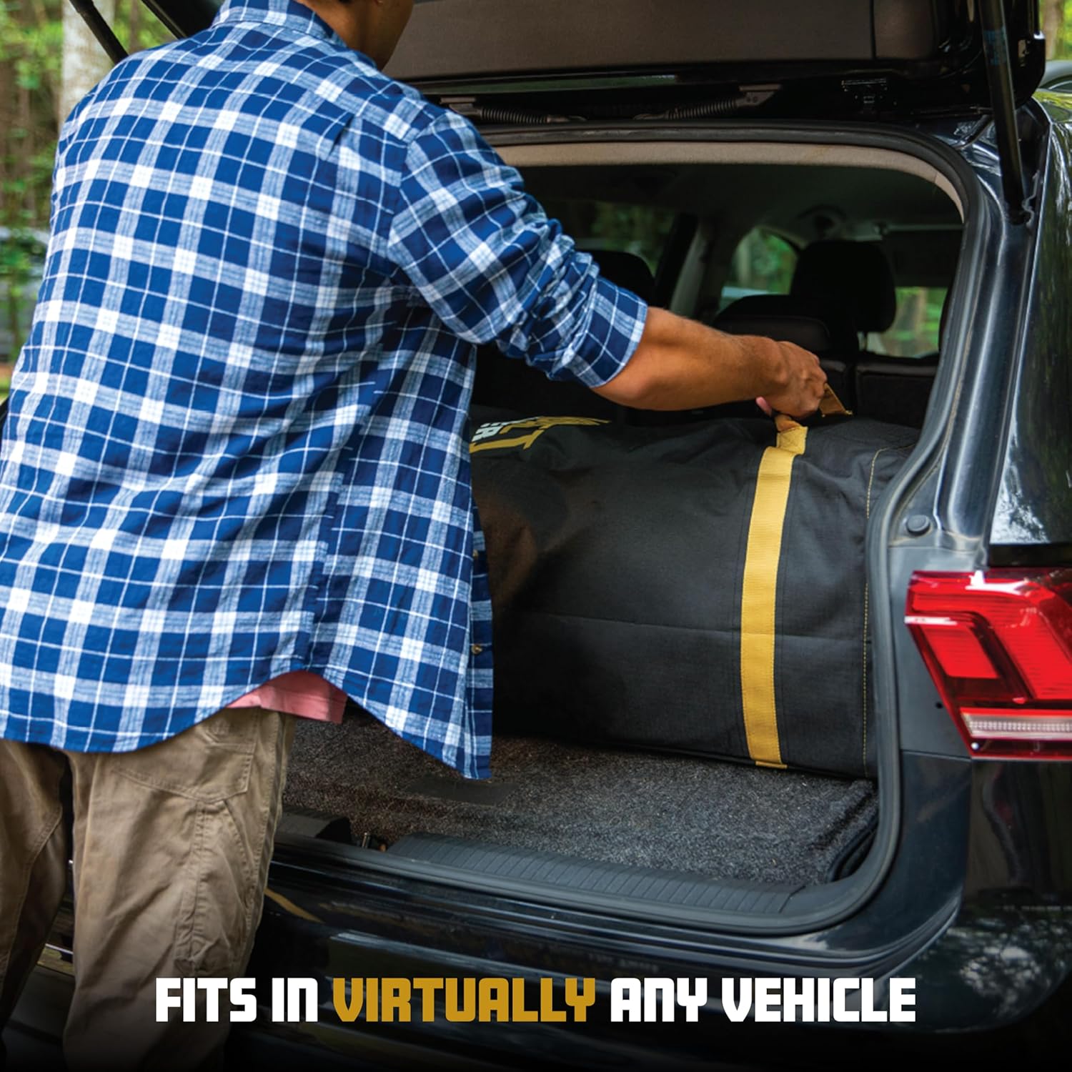 - [๐จ๐น๐๐ฟ๐ฎ-๐ฃ๐ผ๐ฟ๐๐ฎ๐ฏ๐น๐ฒ ๐๐ฒ๐๐ถ๐ด๐ป, ๐ฃ๐ฒ๐ฟ๐ณ๐ฒ๐ฐ๐ ๐ณ๐ผ๐ฟ ๐ง๐ฟ๐ฎ๐๐ฒ๐น] : Built Tough, Packed Small. Folds to 41", fitting in any vehicle, unlike large pop up canopy options. Our weatherproof canopy comes with the Roller Wheel Bag & Tie Down Kit with heavy duty handles, storage pocket, and strong roller wheels for easy transportation and setup. The Compact Shelter can fit in most car trunks easily for your next event.