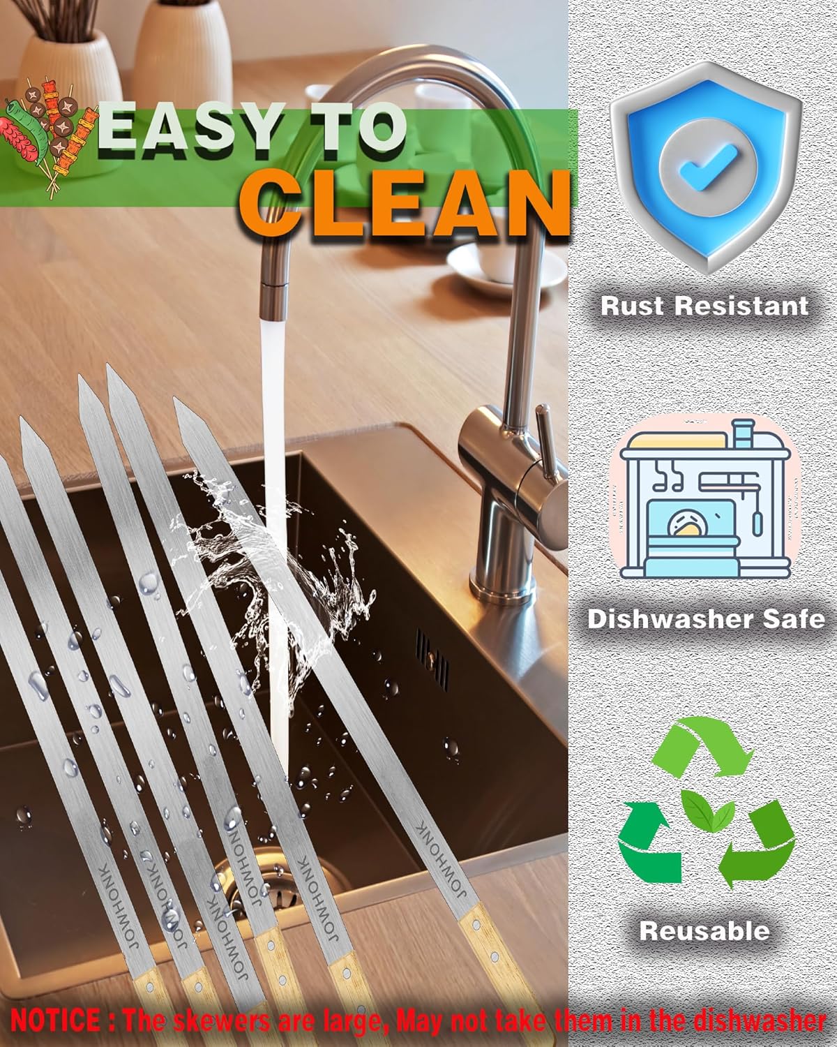 - 【FOOD GRADE 304 STAINLESS STEEL】JOWHONK heavy-duty skewers for grilling are 23.5 inch long,1 inch wide,0.07 in thickness. Our wooden handle flat metal skewers for kabobs are made of premium 304 stainless steel, Ensuring non-rust long time durability, Heat resistant and non-poisonous,Harder than other stainless steel and iron. It's safety for children.Our 304 stainless steel barbecue skewers are reusable. The BBQ kabob skewers surface is smooth that grilled food residue won't get stuck onto the kabob skewer blade.