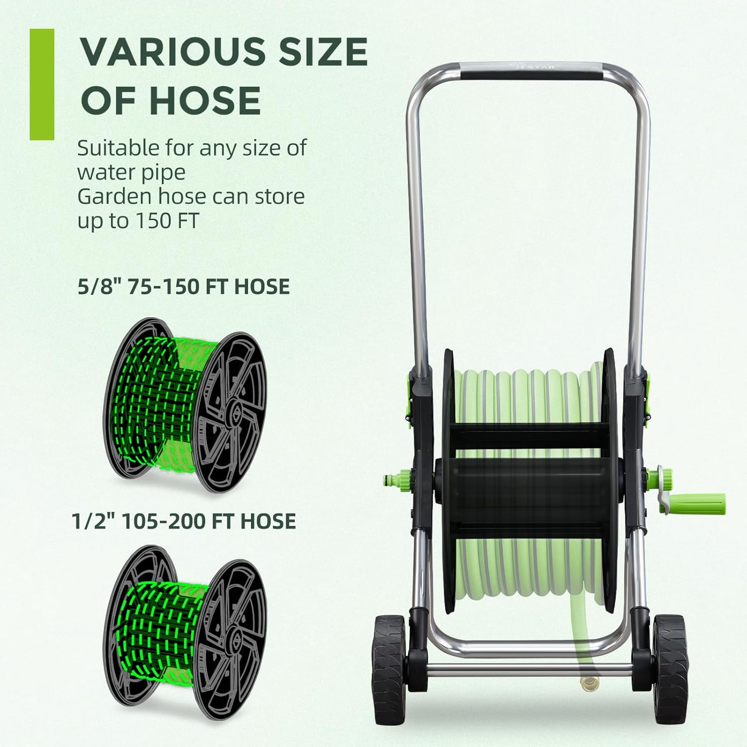 - LARGE CAPACITY: ☘️ This hose cart can hold up to 75-150ft feet of 5/8" hose; The hose cart also comes with a non-slip handle, which allows you to easily roll up the hose so that the hose is not kinked and stored neatly.