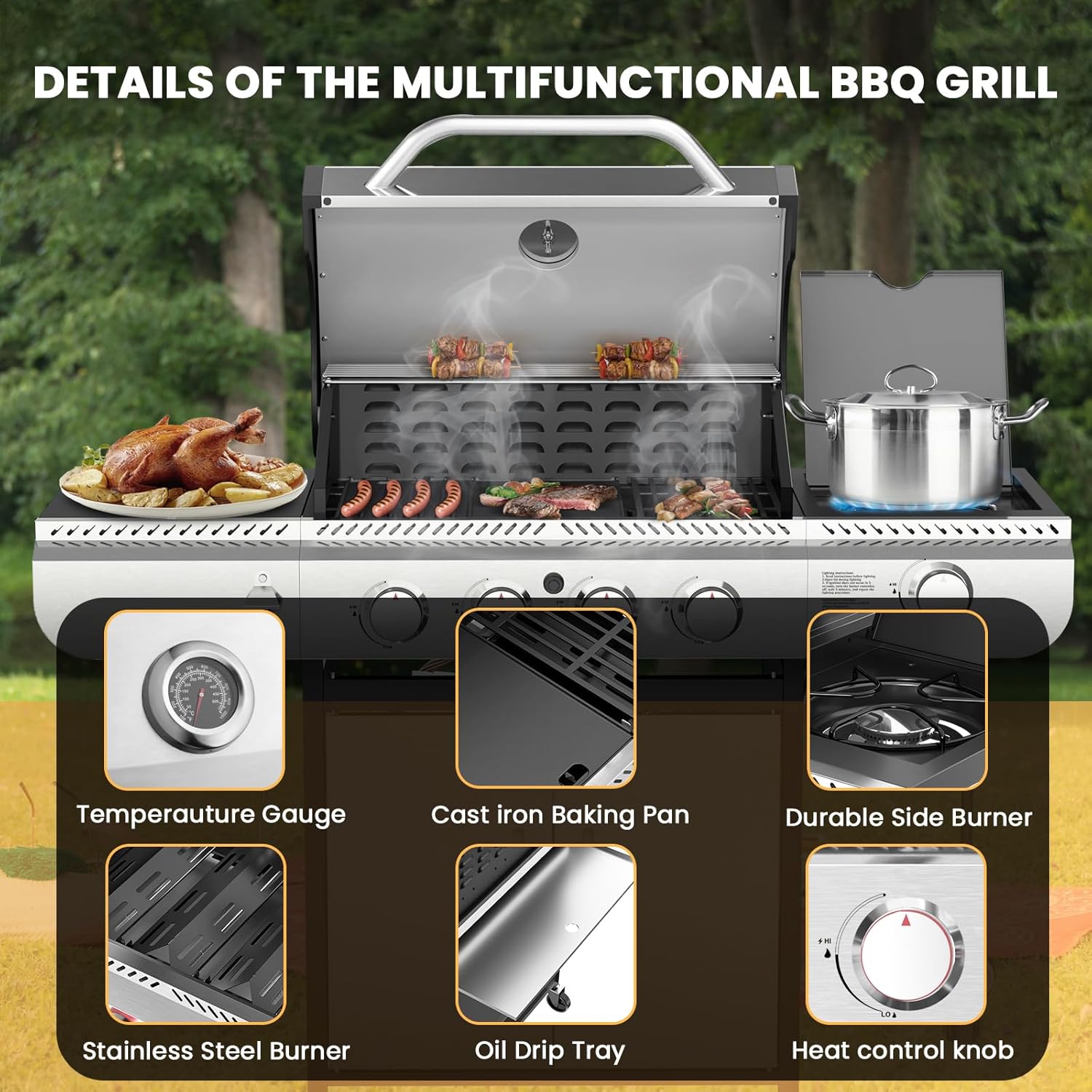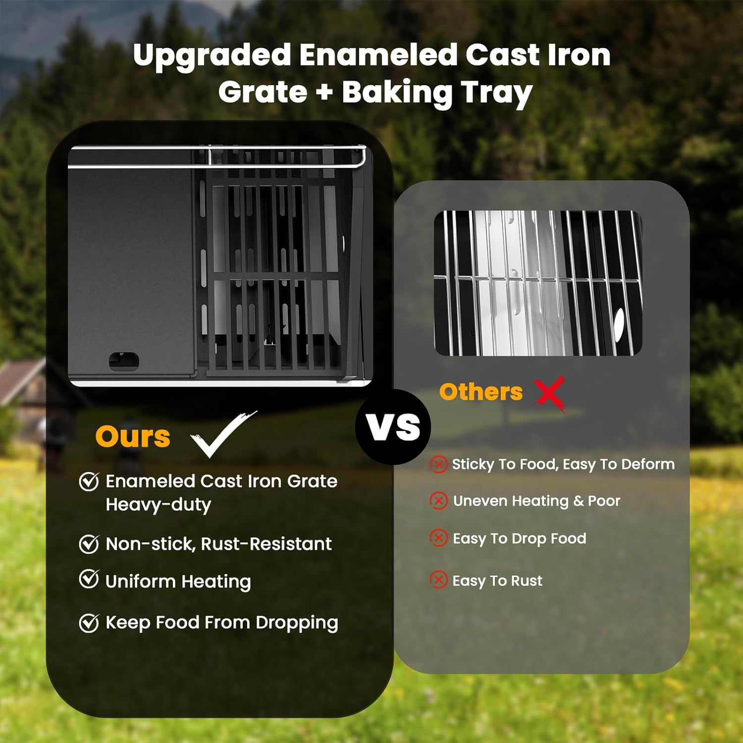 - Upgraded Enameled Cast Iron Grate And Baking Pan:Compared with traditional porcelain enameled grates, these cast iron grates are durable, non-stick, rust-proof and crack-resistant. In addition, the newly added baking tray can prevent food from falling and heat more evenly, meeting diverse cooking needs