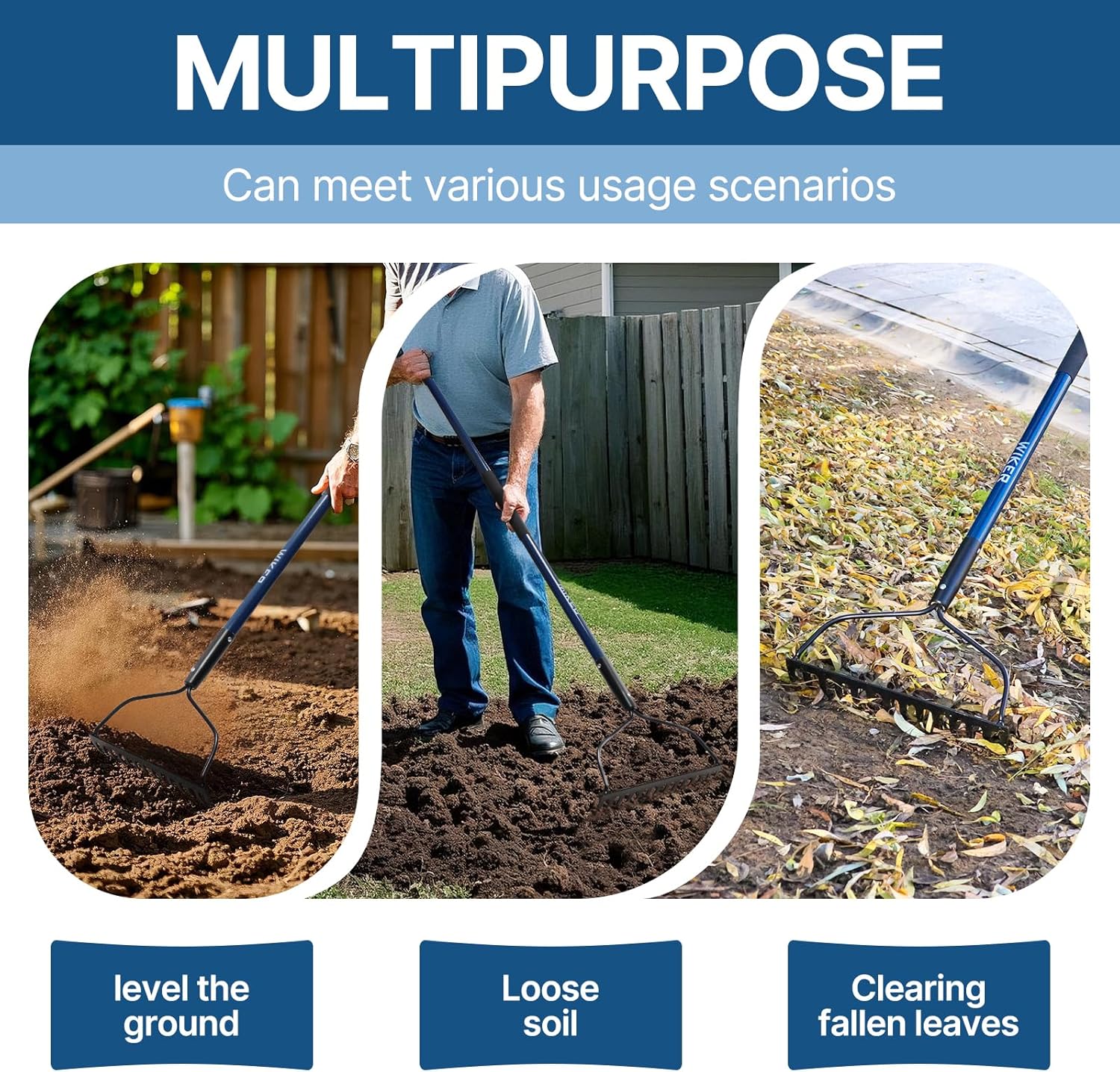 - Multi Purpos:Garden rake built to take on the toughest jobs.It’s been extremely useful in cleaning out and spring-prepping the flower beds,it allowed you to scoop up the dead leaves and other debris while at the same time scraping into the underlying dirt,prepping the surface for upcoming leveling,mulching,and planting annuals.This is one of those gardening tools that will last a lifetime.