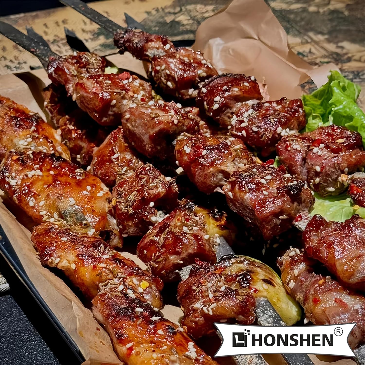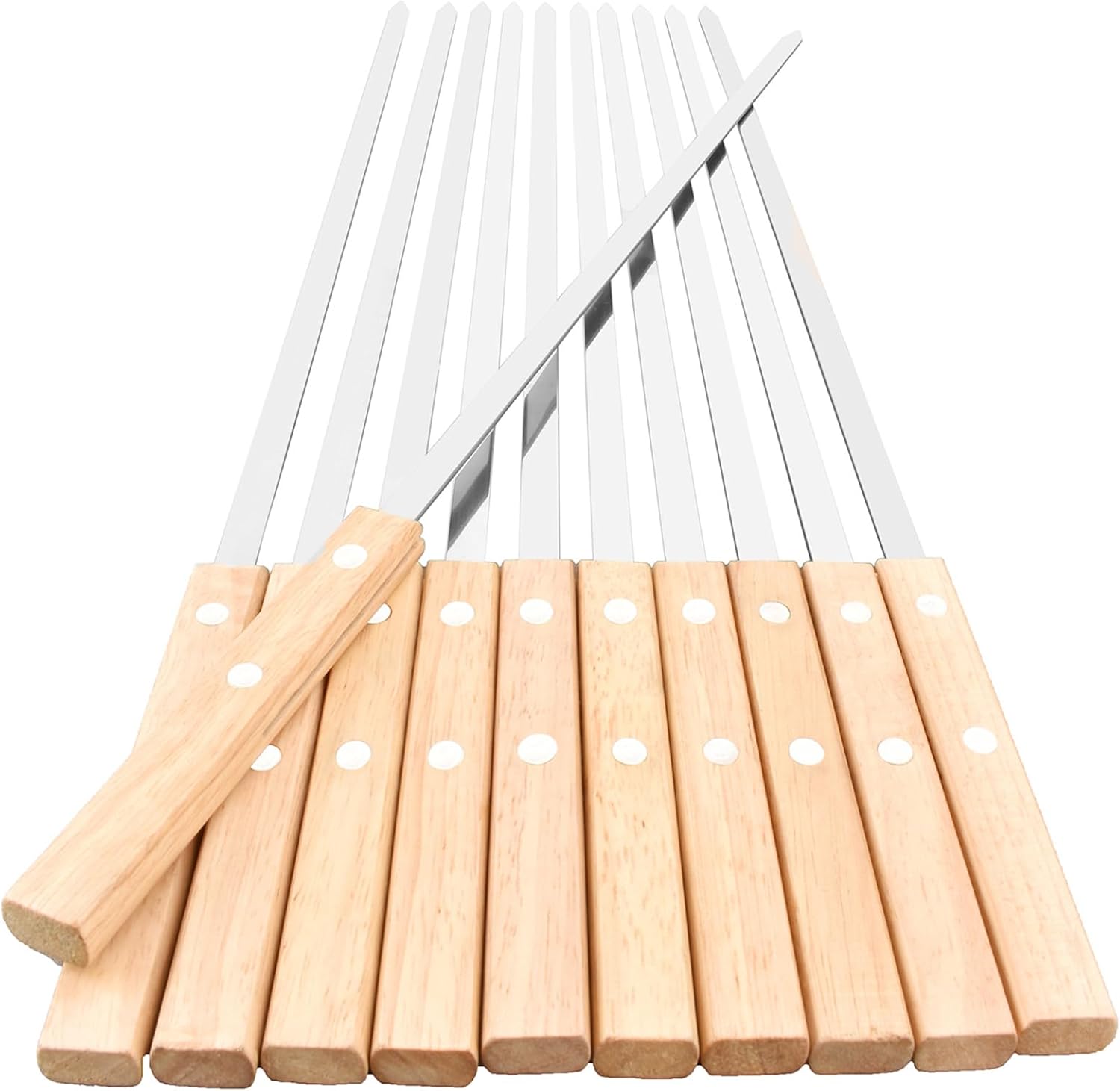 - 22 Inches long shish kabob skewers, Rust resistant stainless steel blade,Comfortable wooden handle grip;