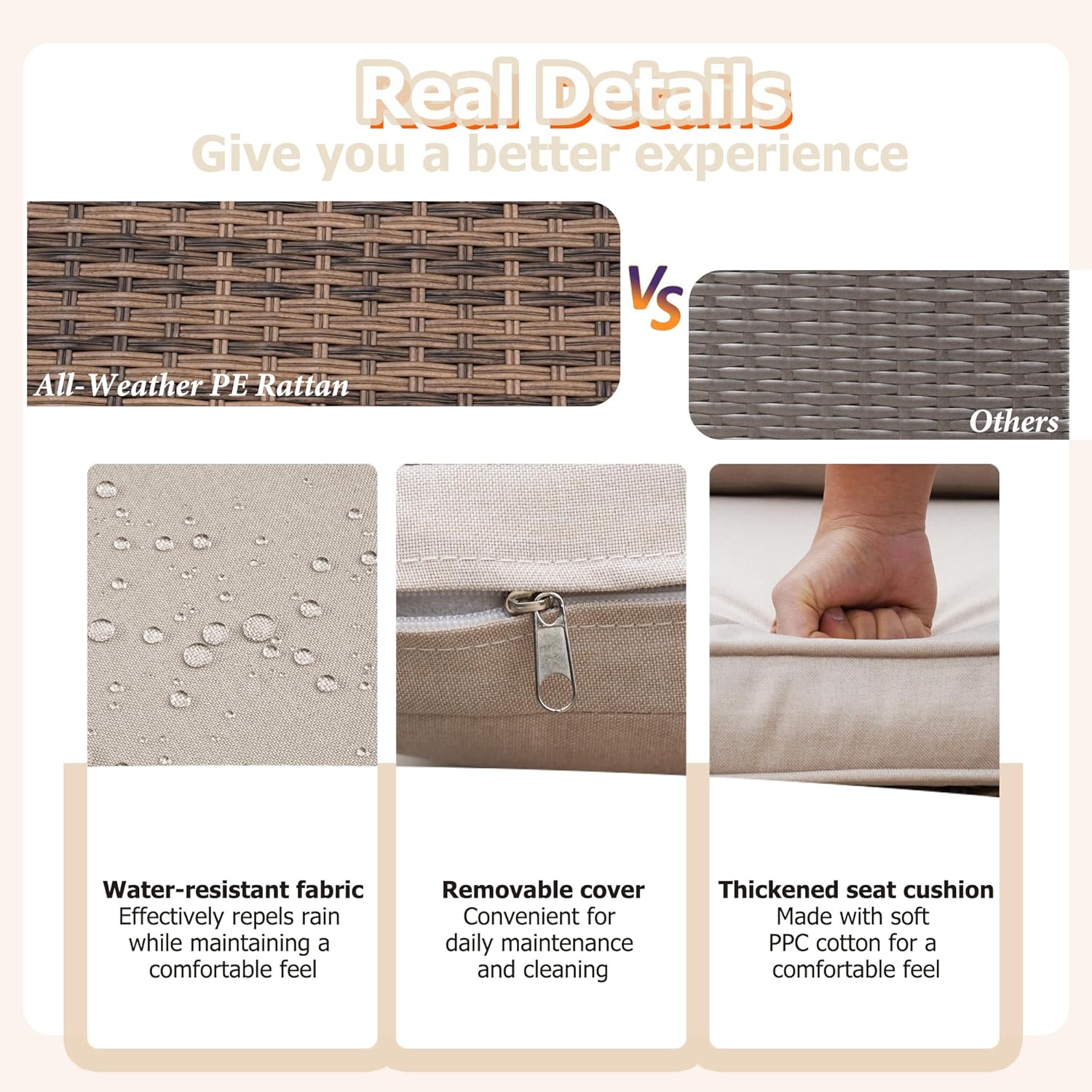 - Durable All-Weather Material Crafted with hand-woven brown PE rattan and a strong steel frame, this sectional conversation sofa is highly durable to withstand rain, wind, and long-term outdoor use