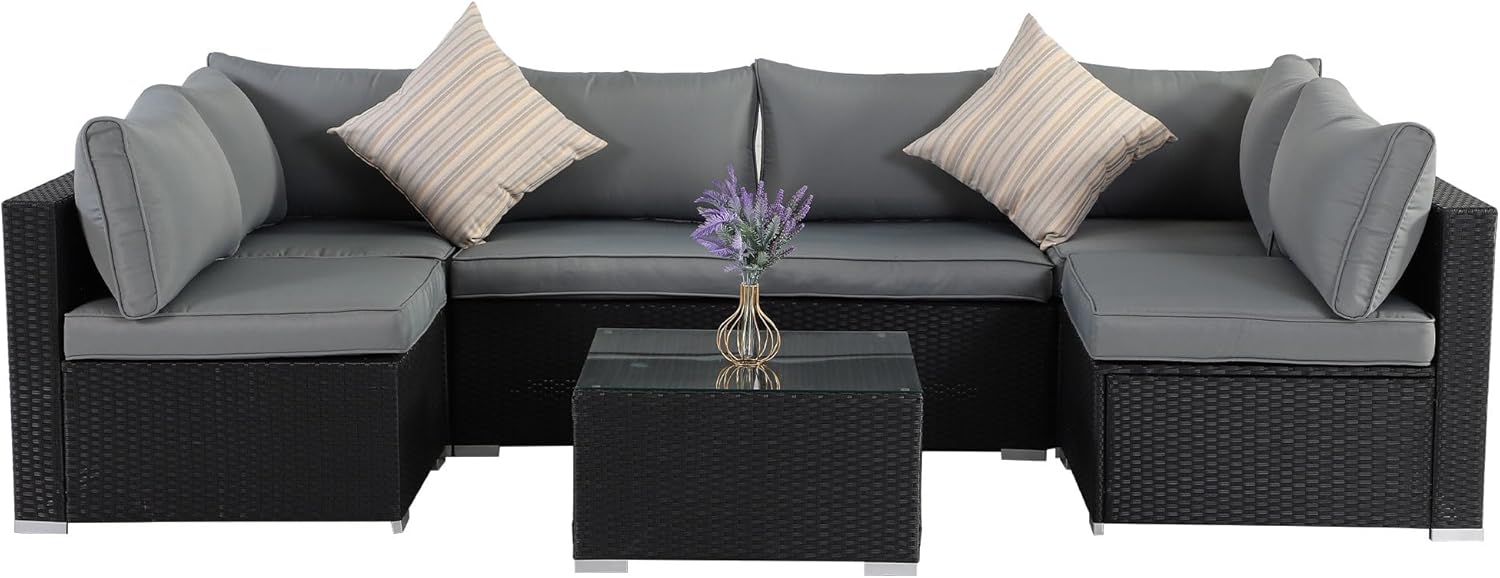 7-Piece Patio Furniture Set - Outdoor Sectional Sofa Set with Cushions and Glass-Top Coffee Table for Gardens, Poolside, Backyards and Porches, Black/Grey