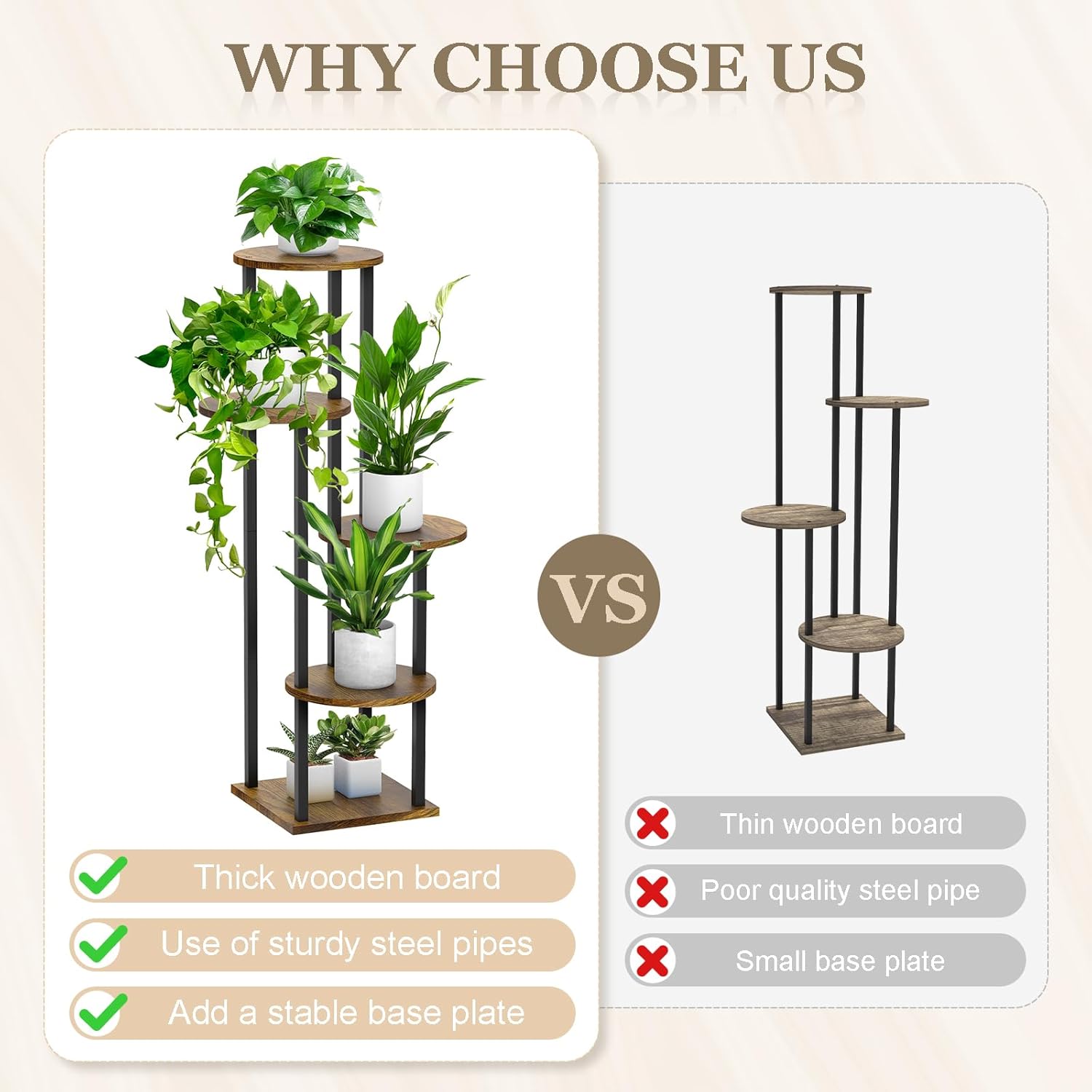 5 Tier Plant Stand Indoor, Metal Wooden Tall Plant Shelf Flower Pot Stand for Multiple Plants, Corner Flower Holder Plant Display Rack for Living Room Balcony Patio Garden (Rustic Brown)