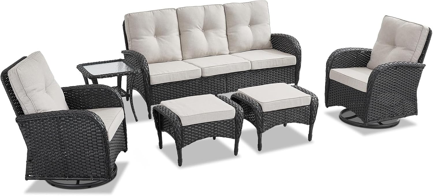 - 4.LUXURIOUS OUTDOOR RETREAT ENSEMBLE: Relax in the beautiful outdoors with this perfect 6 pieces patio glider furniture set. Our patio swivel rocker chair set with high quality foam cushion, comfortable and soft rebound good. The cushion cover is made of olefin outdoor water-resistant fabric. The seat and backrest are made of beautifully woven wicker coupled with ergonomic design, making it a classic upgrade for any porch, deck or patio.