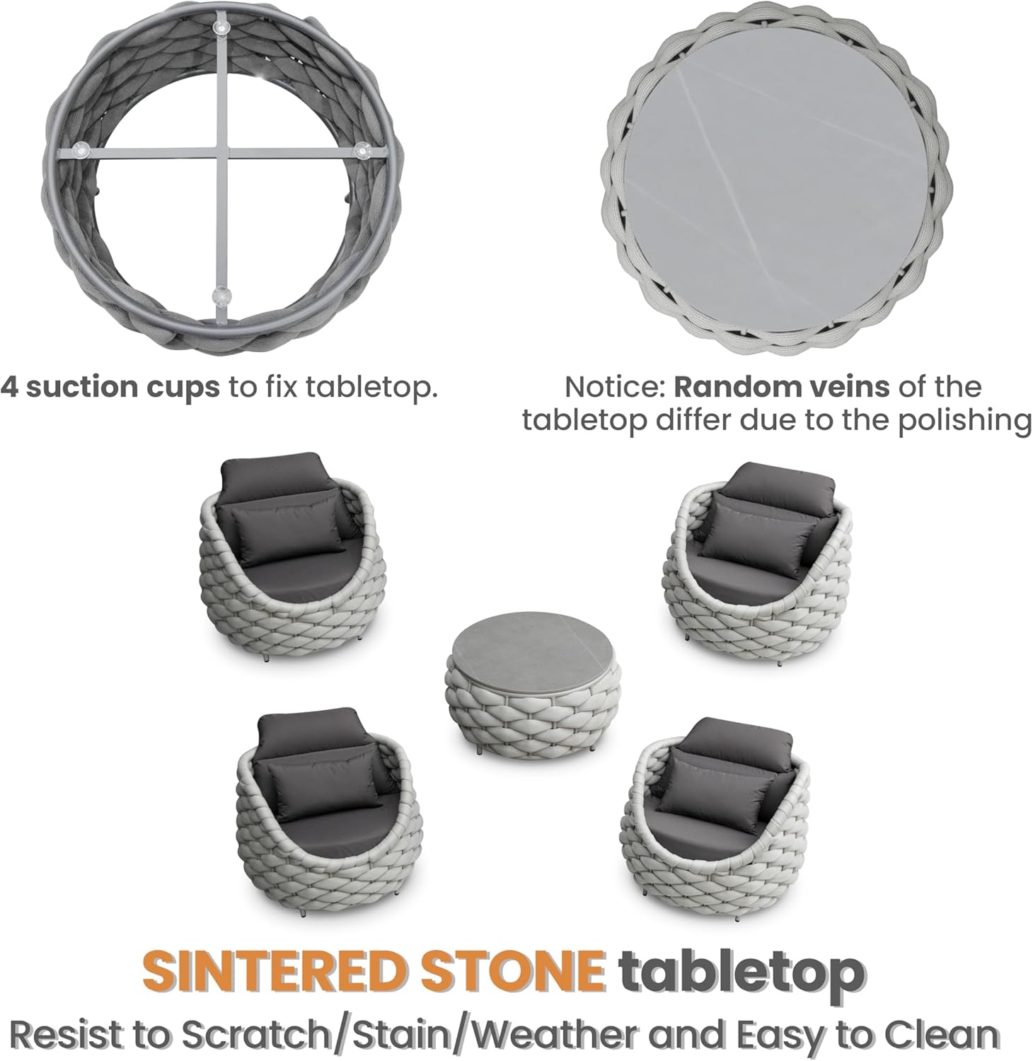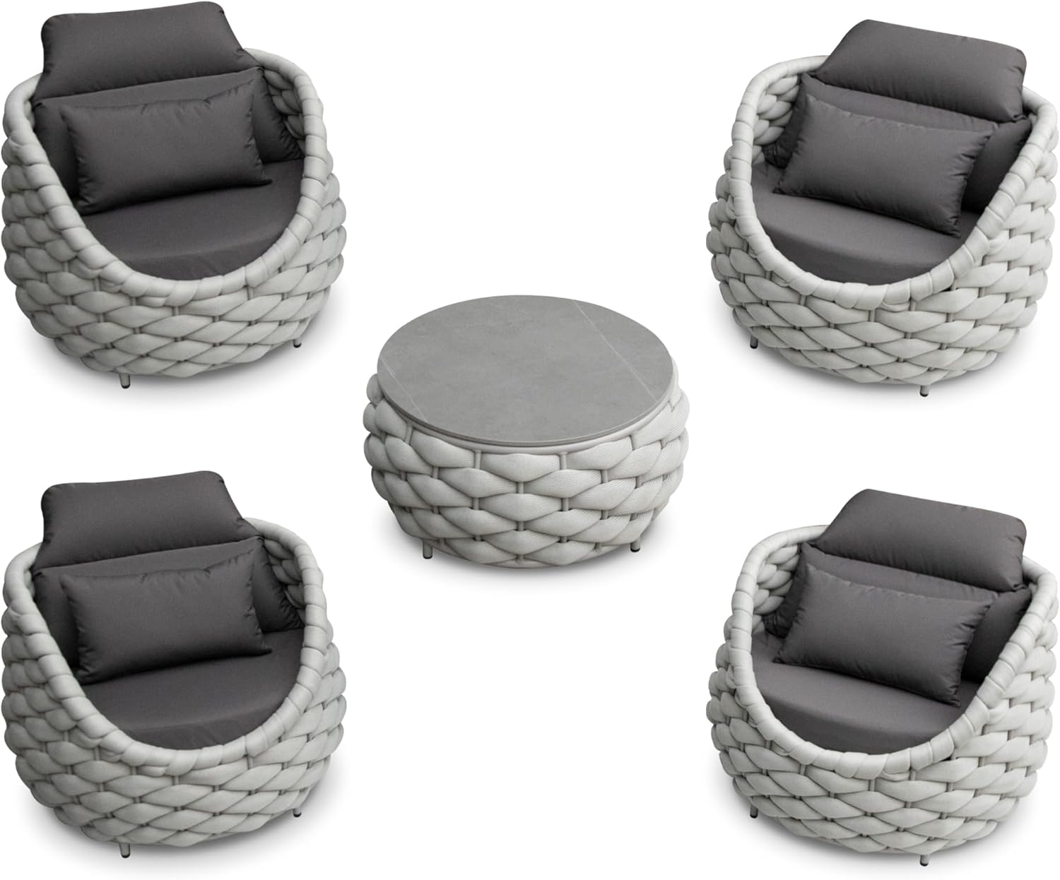 - Furniture set is crafted from reinforced rust-free aluminum alloy frame, wrapped in hand woven polyester rope. The 5 pieces all weather patio upholstered conversation set resists to UV, rain, wind, salt water. Perfect for indoor outdoor even arid or coastal areas