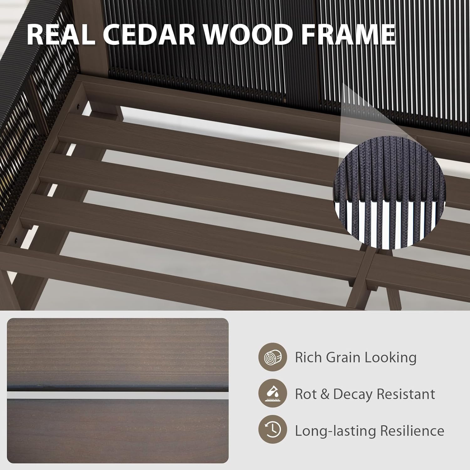 - PREMIUM NATURAL CEDAR WOOD: Crafted with natural cedar wood, this patio furniture set is the perfect blend of strength and style, adding a rustic charm to any outdoor setting. Cedar’s durability makes it resistant to rot, decay, and insect damage, ensuring long-lasting resilience and beauty.