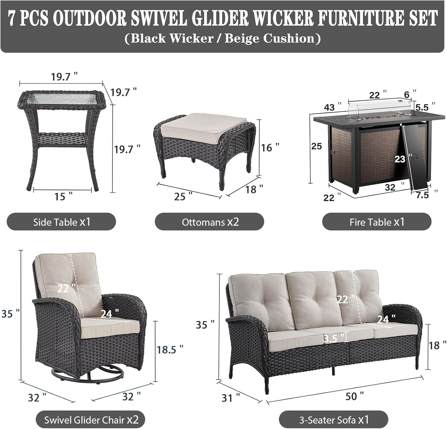 - Size : 8 PCS - Swivel Glider & Sofa & Fire Table