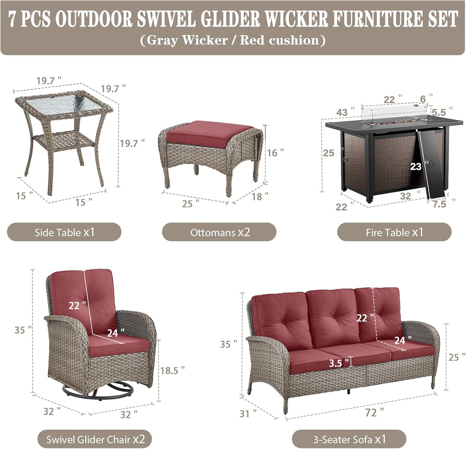 8 Piece Patio Furniture Set with 50000 BTU Propane Fire Pit Table, Outdoor Conversation Set with 2 Swivel Rocker Chairs Wicker Sofa and Ottomans for Casual Gatherings Red Cushion
