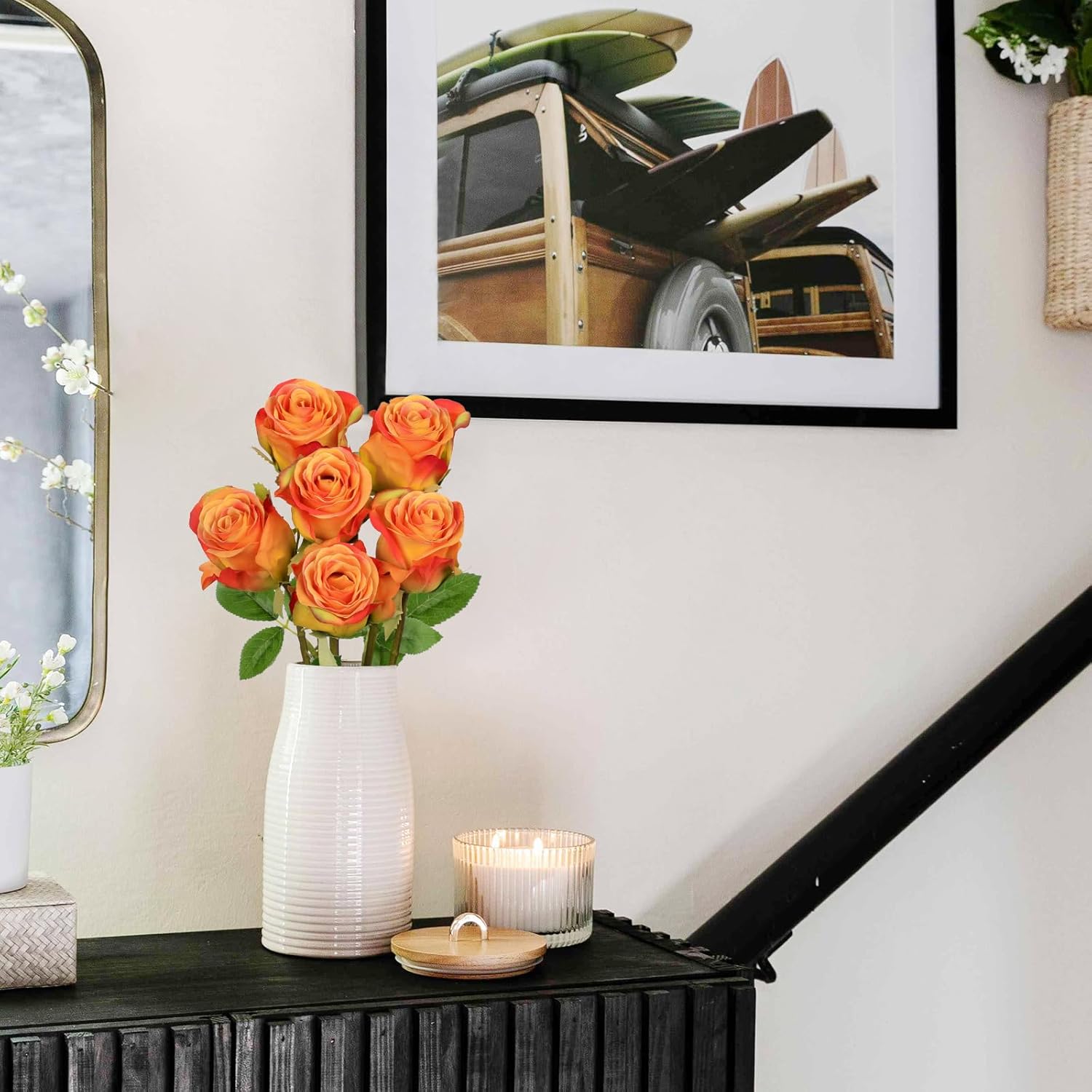 - Lifelike Appearance : Each artificial rose showcases delicately layered petals in an orange & red shade, enhanced by subtle tonal variations for a natural, elegant look. Ideal for those seeking high-quality, realistic rose bouquets to elevate home décor, weddings, or special events with a gentle touch of romance.