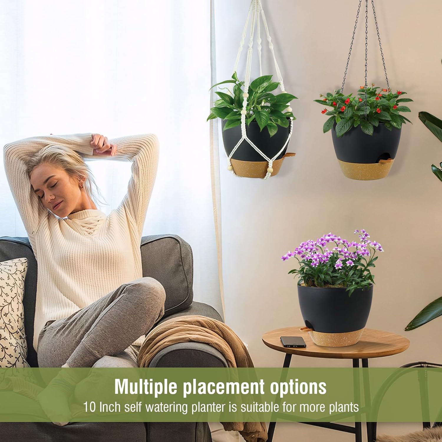 10 inch Self Watering Hanging Planters, 2 Pack Hanging Flower Pots for Indoor Outdoor Plants, Hanging Baskets with Drainage Holes & 2 Kinds of Plant Hangers for Garden Home Decor, Black Brown