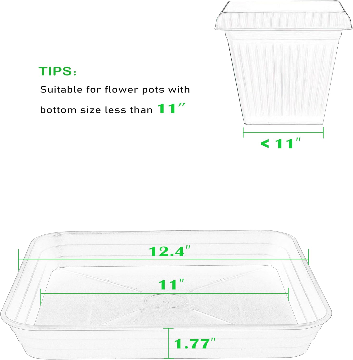 - Square Plant Tray Value: This 12 inch square plant saucer has a reasonable size design. The outer edge of the top is 12.4 inches Length, the bottom width is 11 inches, and the height is 1.8 inches. Square plant trays are suitable for planters